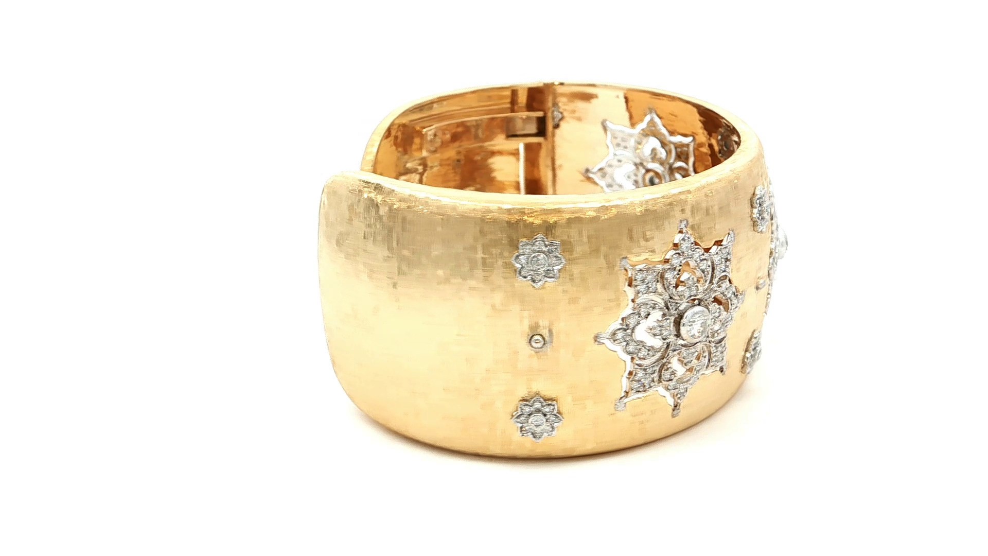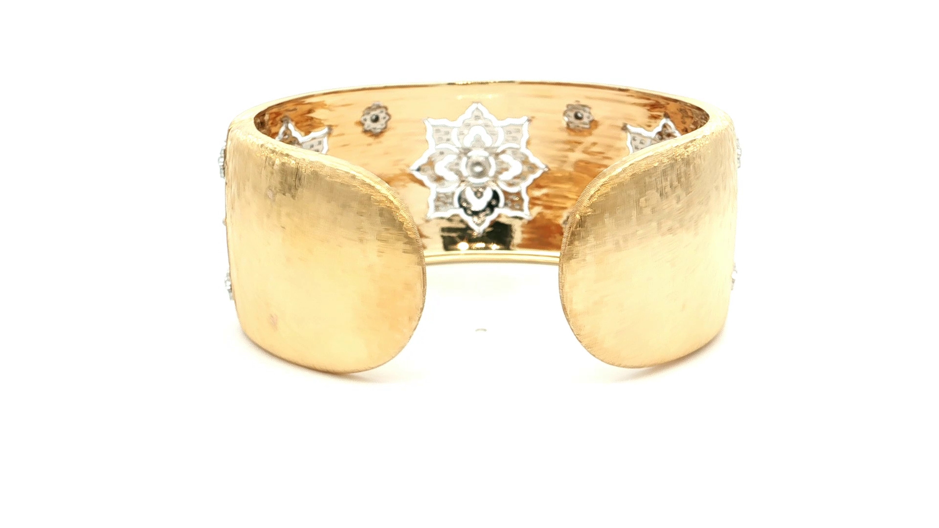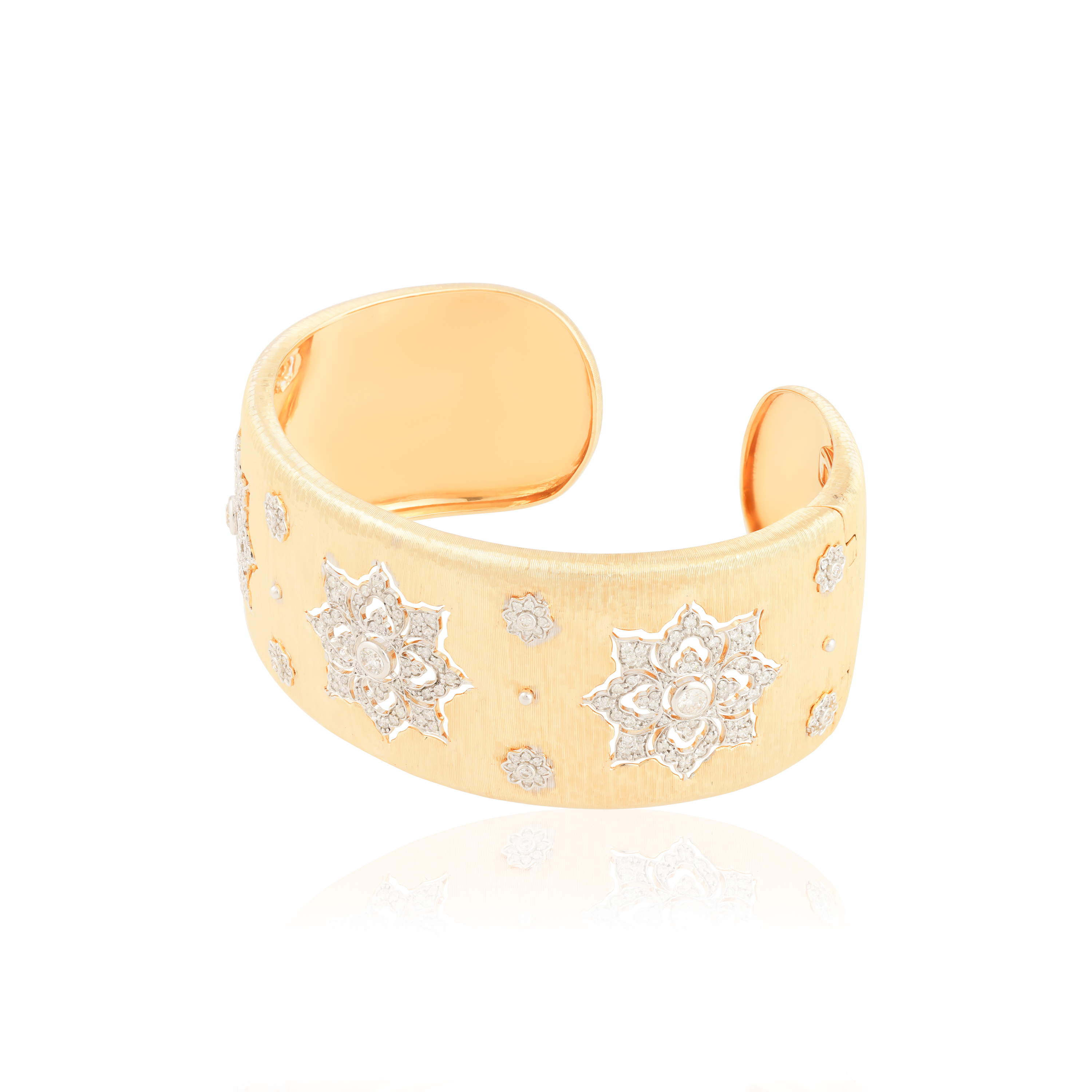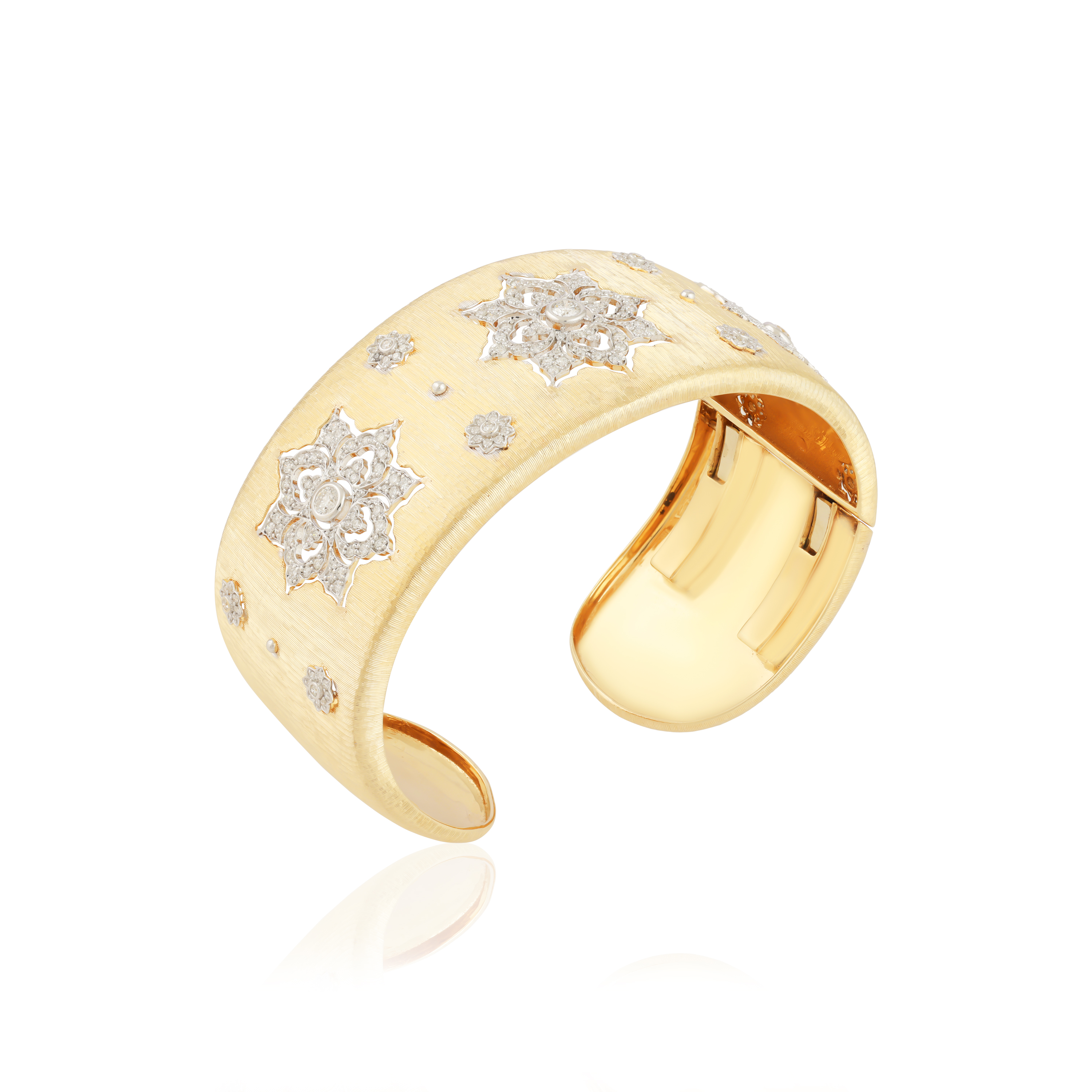 Elevate your style with this stunning yellow gold bangle bracelet in matte finish. Its open design ensures a comfortable fit, while the brilliant round cut diamonds, precisely set in floral motifs, catch the light from every angle. A timeless piece, perfect for adding a touch of sophistication to any ensemble. Size: 45*56 mm