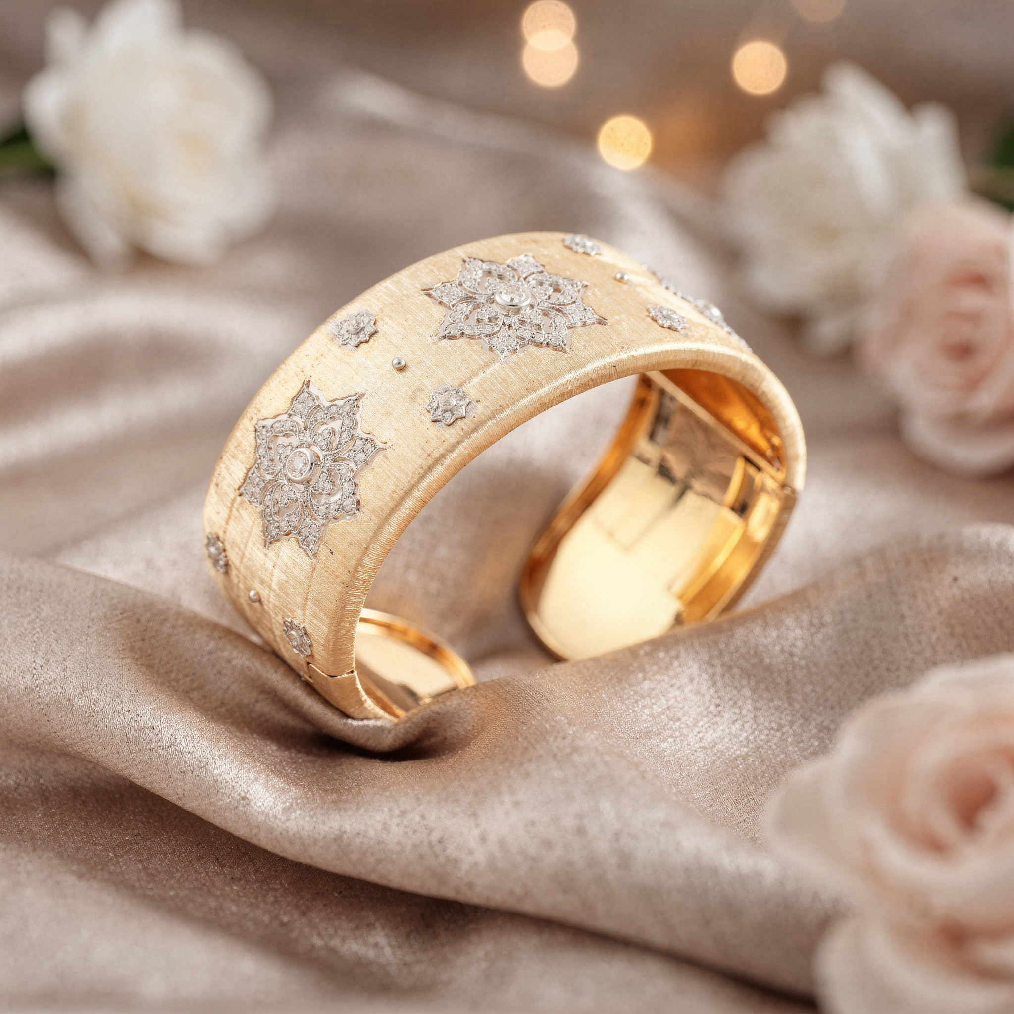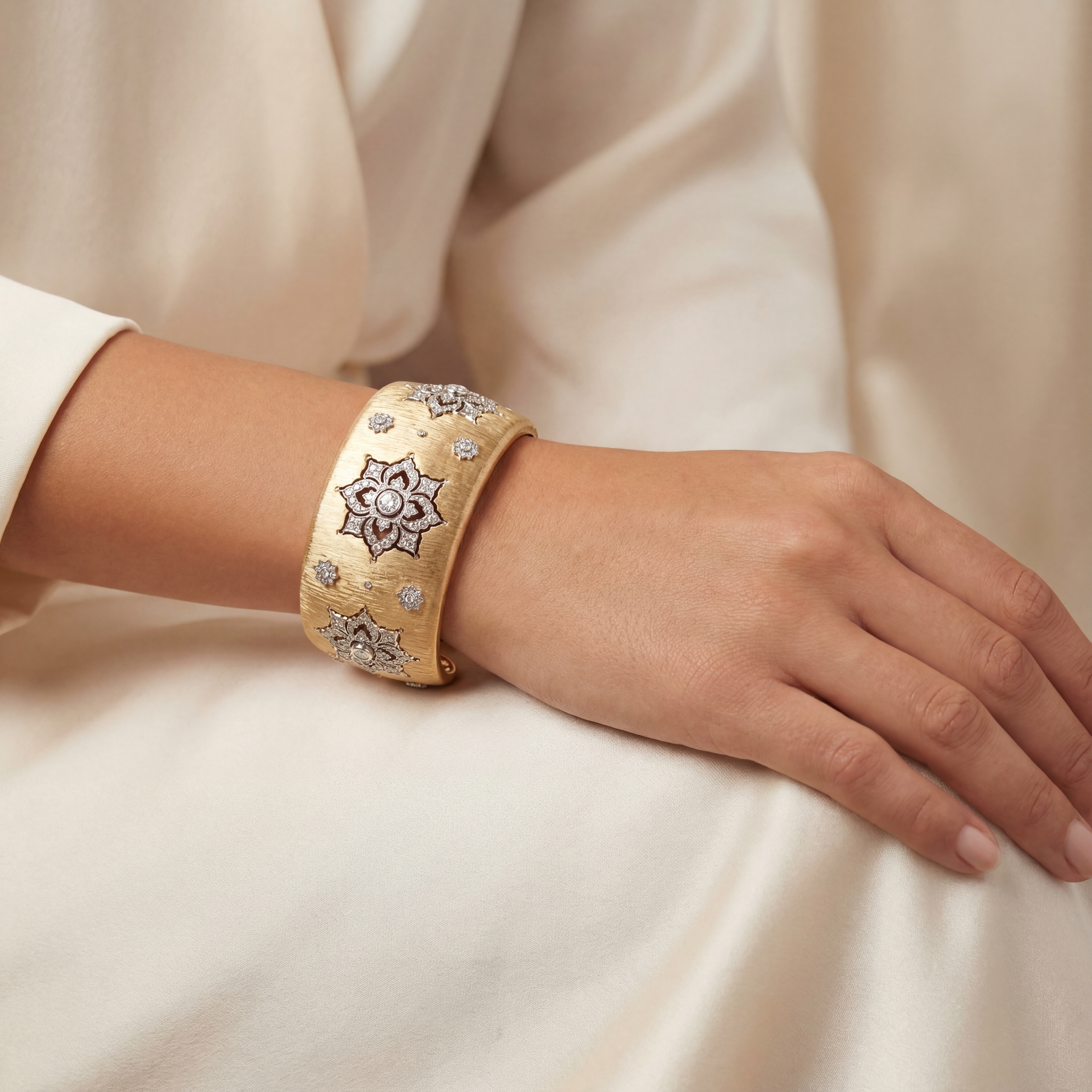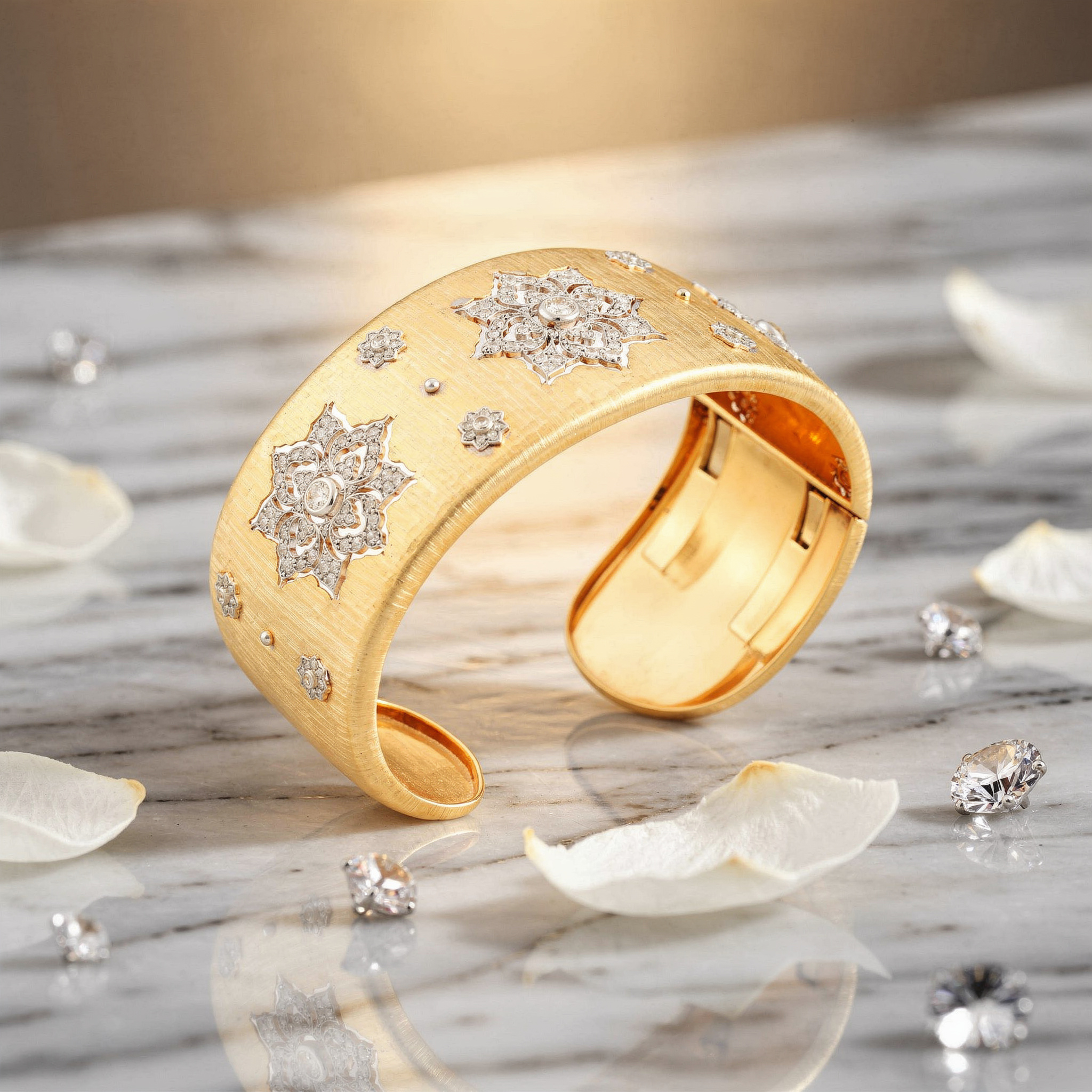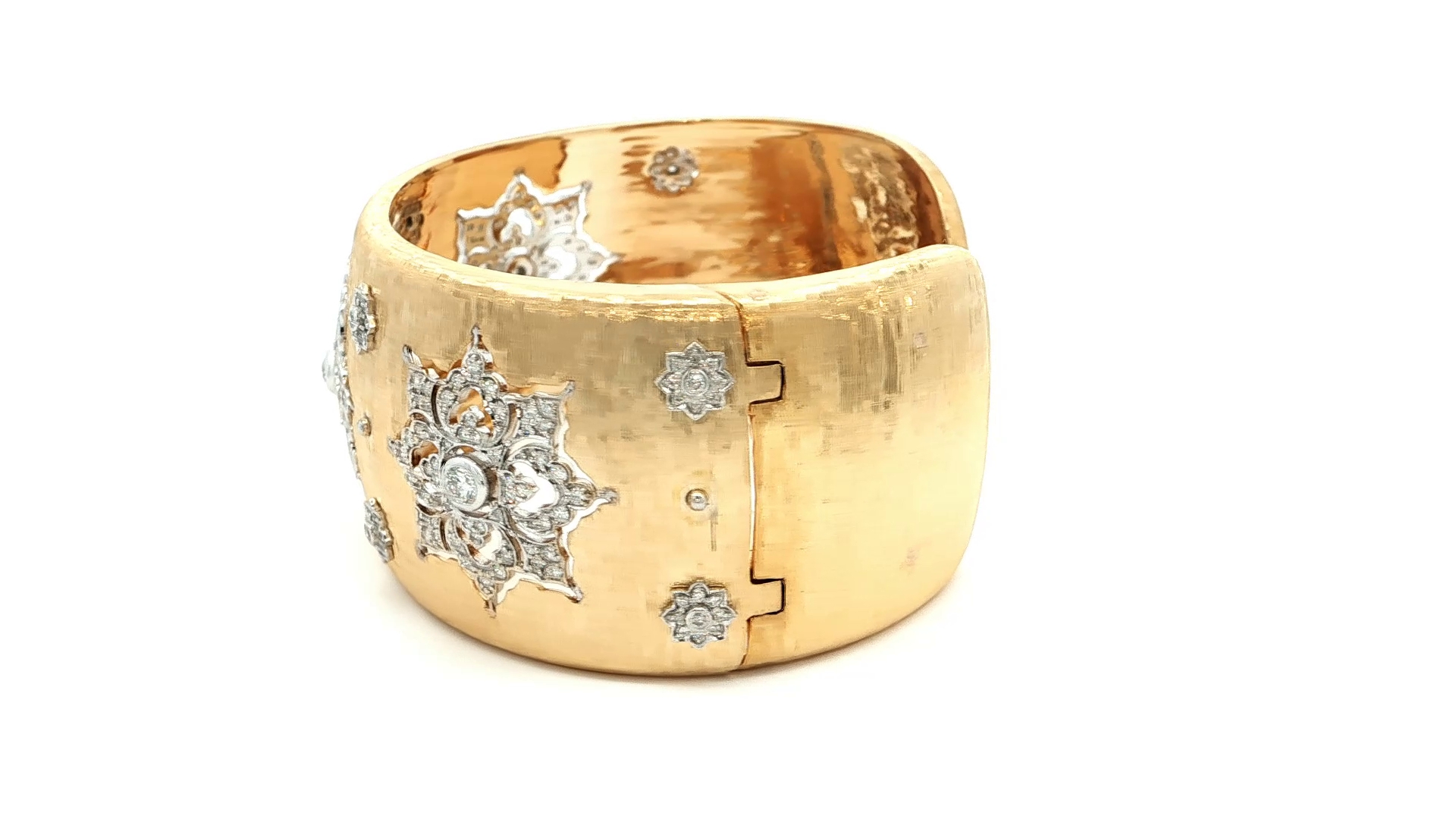 Elevate your style with this stunning yellow gold bangle bracelet in matte finish. Its open design ensures a comfortable fit, while the brilliant round cut diamonds, precisely set in floral motifs, catch the light from every angle. A timeless piece, perfect for adding a touch of sophistication to any ensemble. Size: 45*56 mm