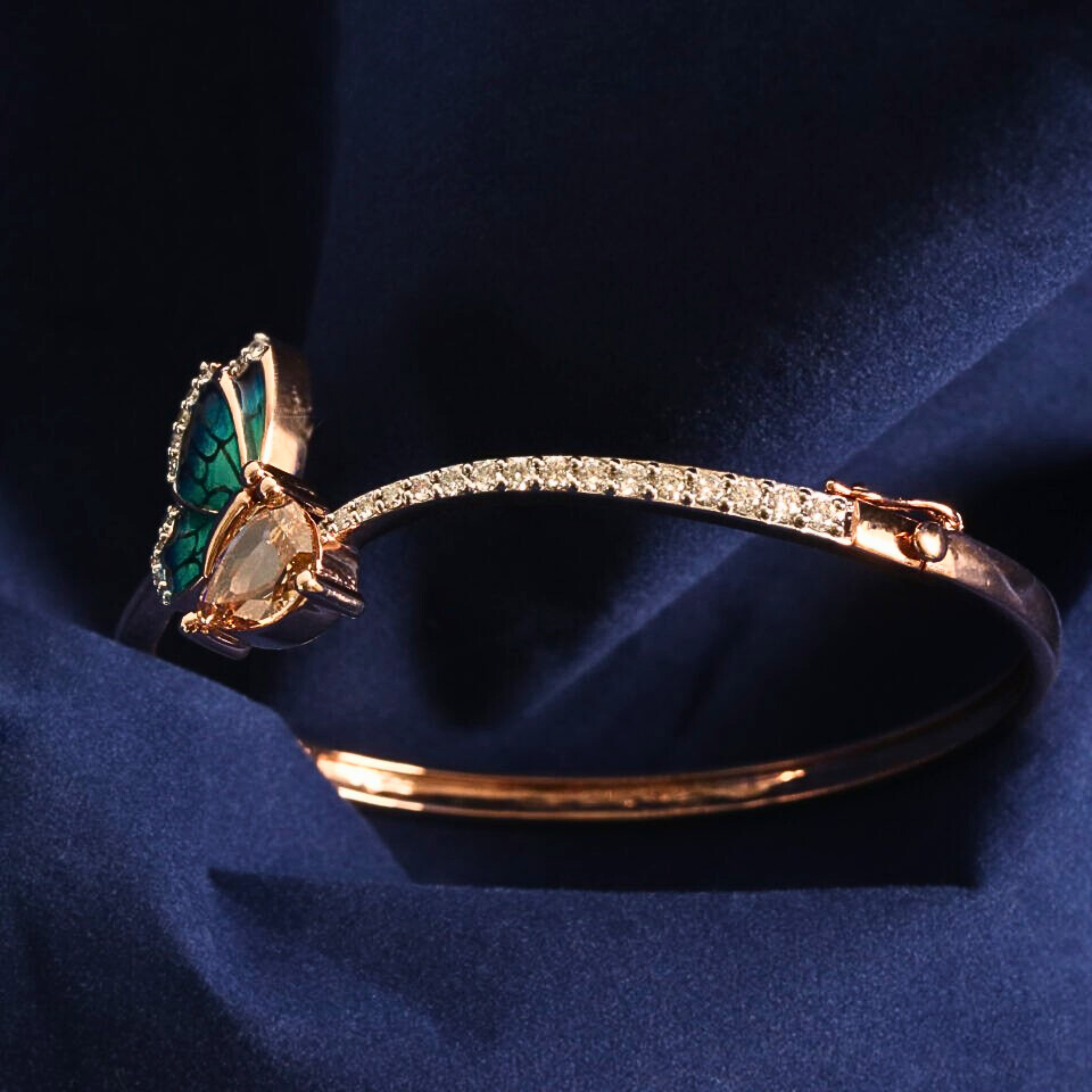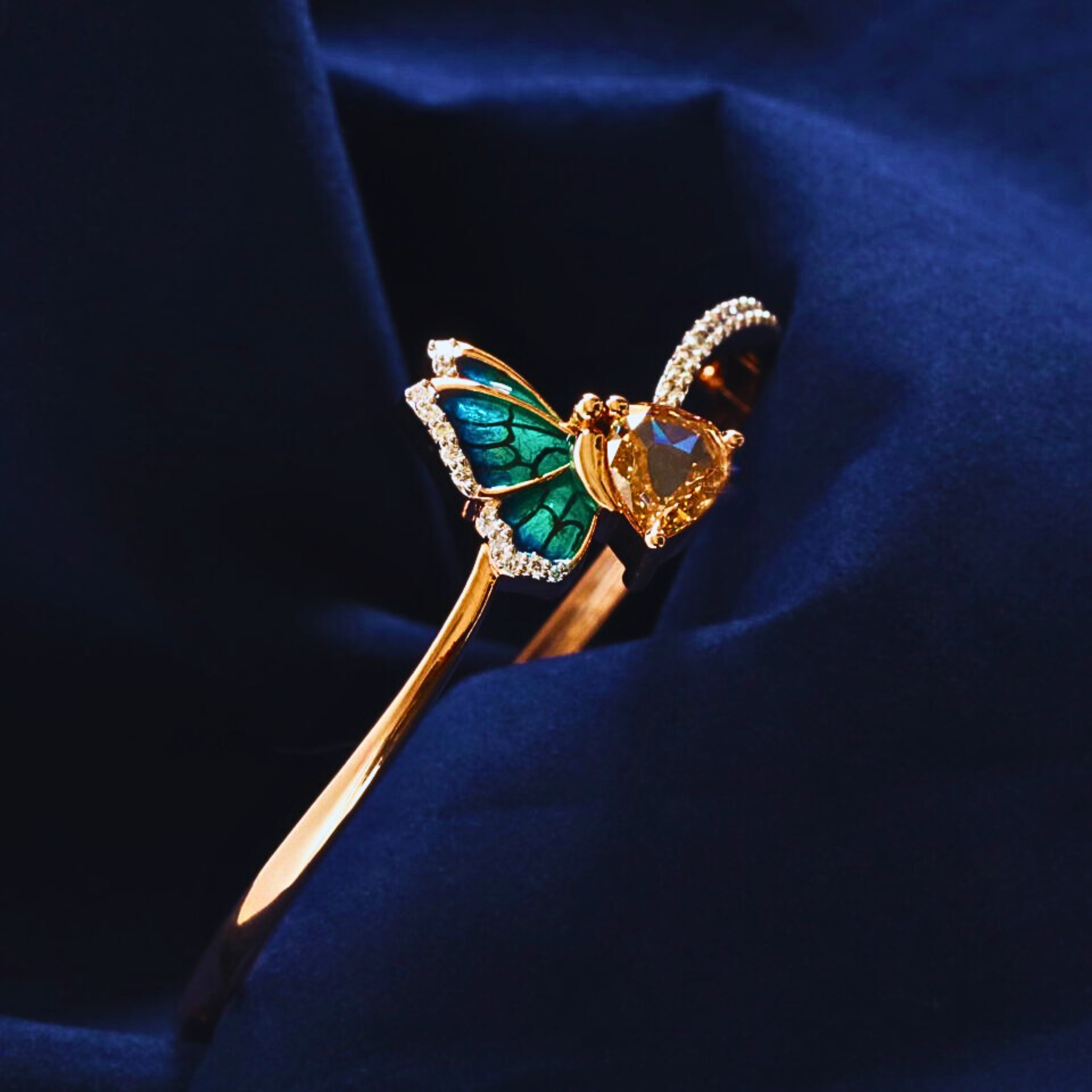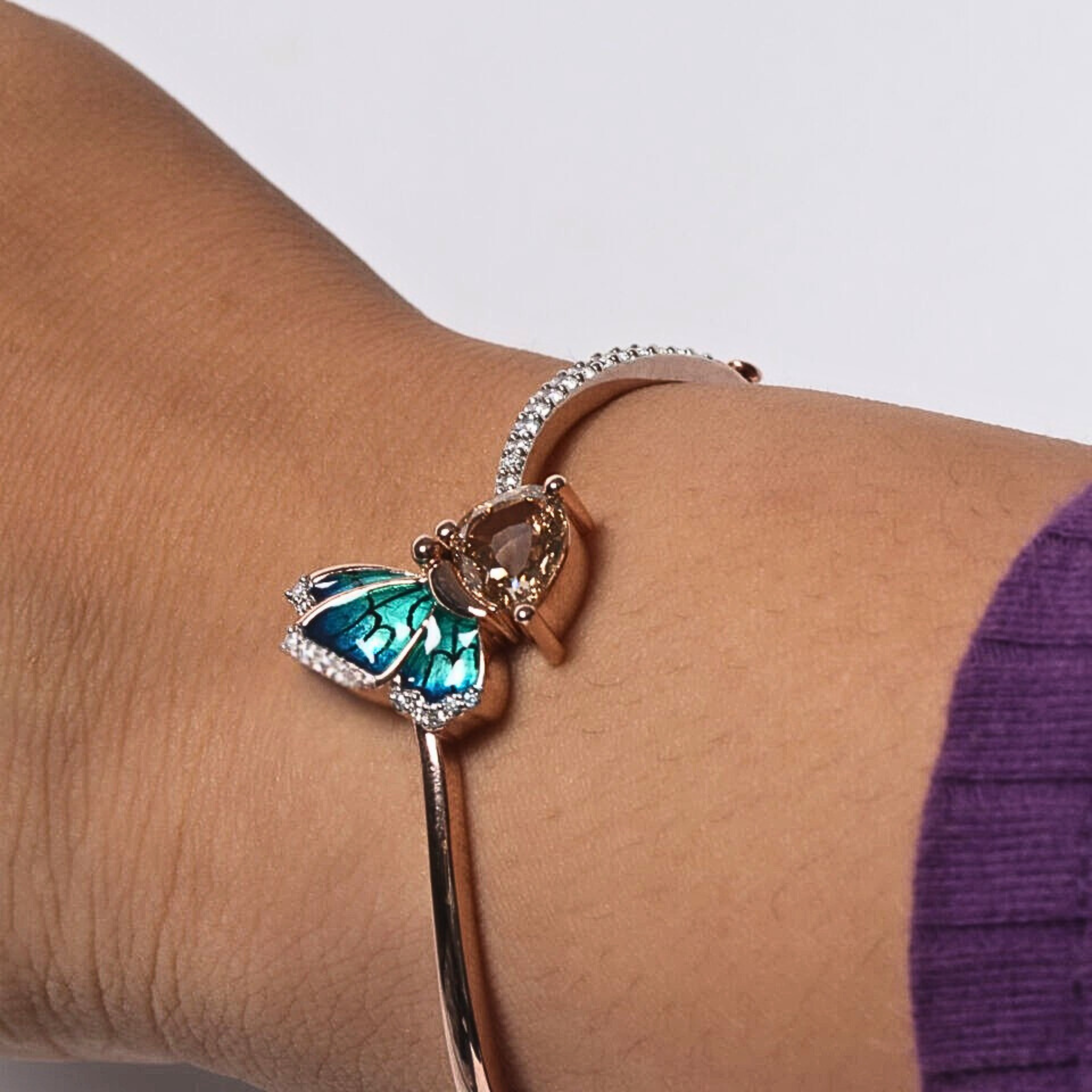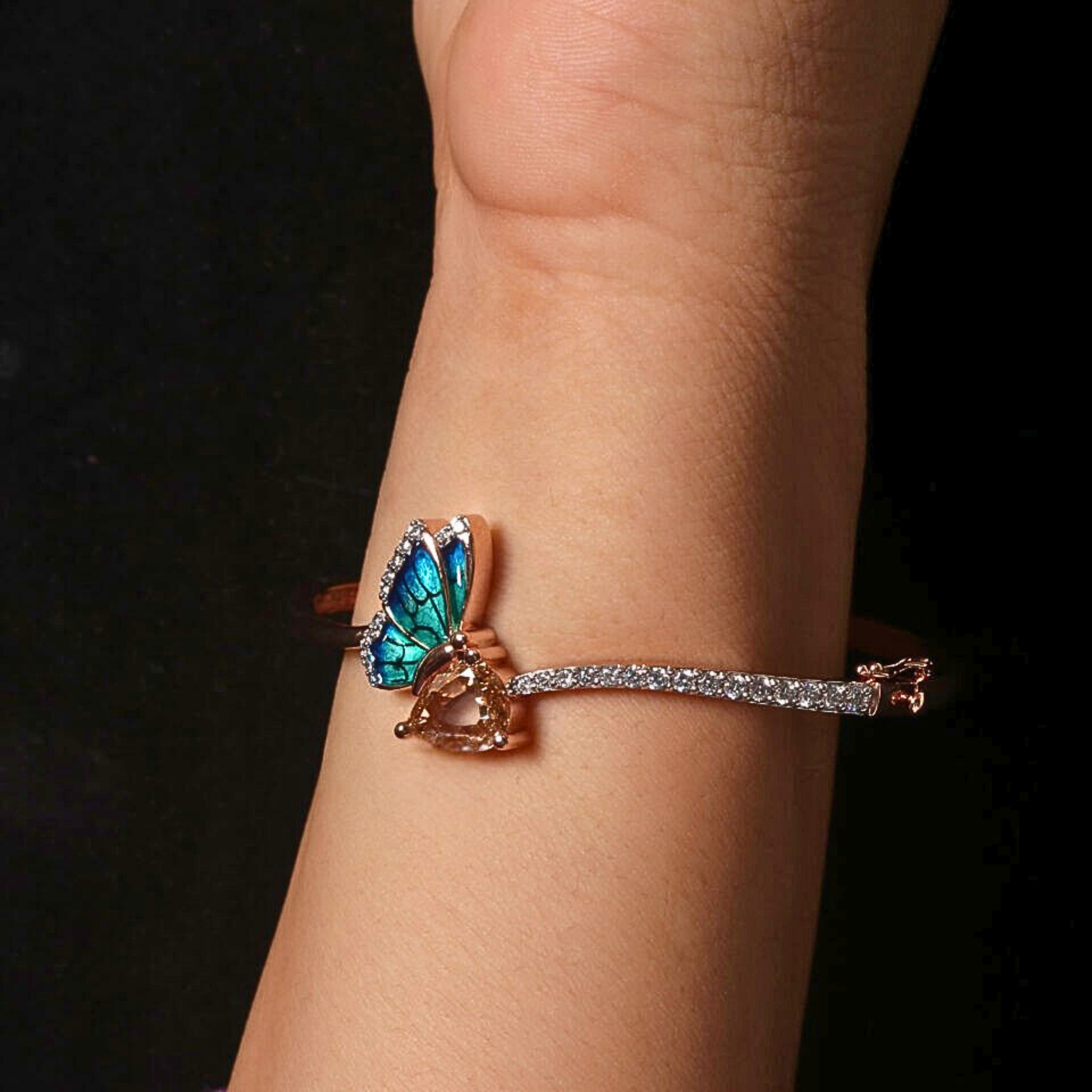 Butterfly Shape Lab Grown Diamond Bracelet. An elegant butterfly-inspired design featuring pear and round lab-grown diamonds in Fancy color and VS clarity for refined brilliance. Total diamond weight 9.75 carats, set in a slim 1.80 mm bracelet width with customization available. Crafted in solid 10KT, 14KT or 18KT gold, offered in yellow, rose and white tones. A distinctive luxury piece for premium retail, bespoke creations and international wholesale distribution worldwide.