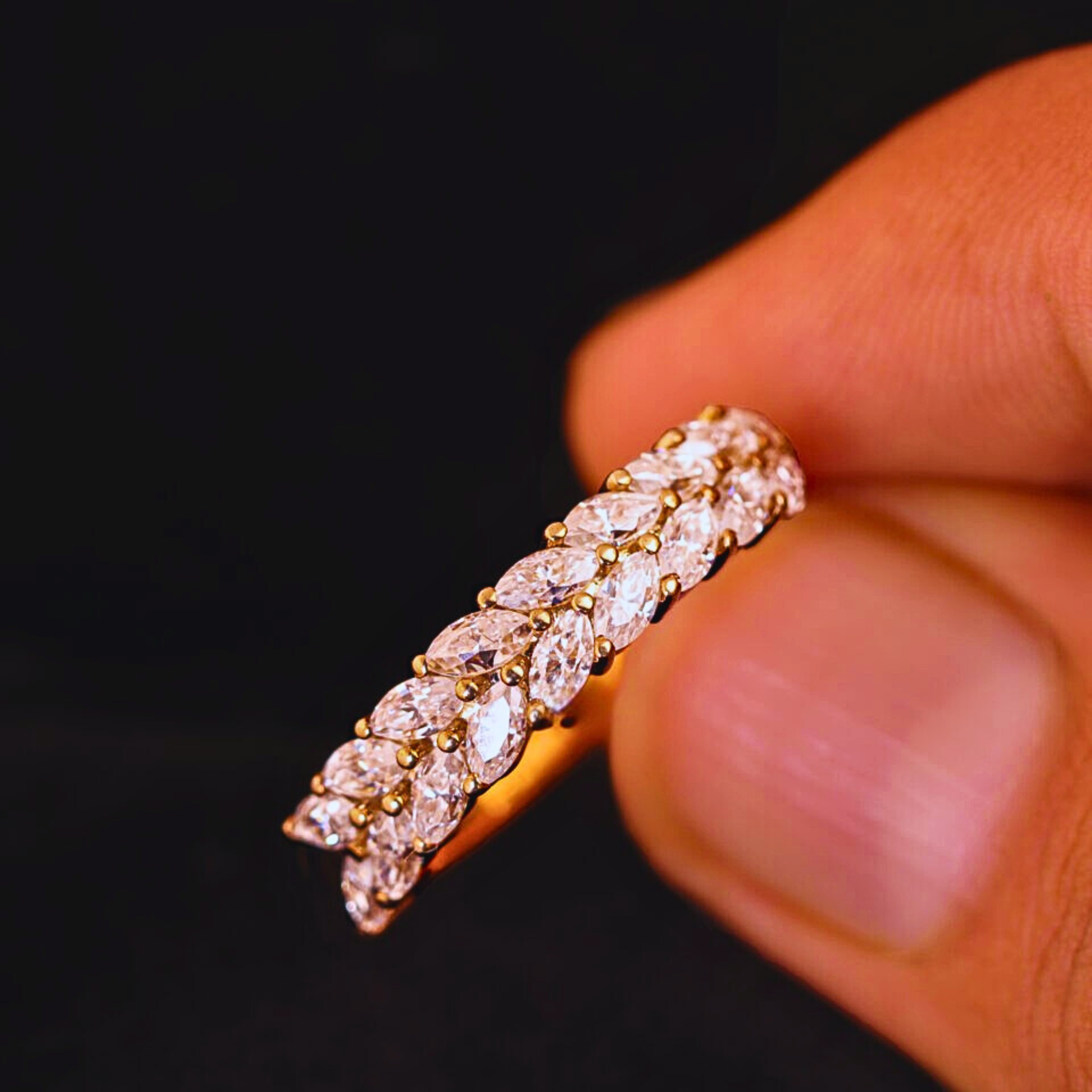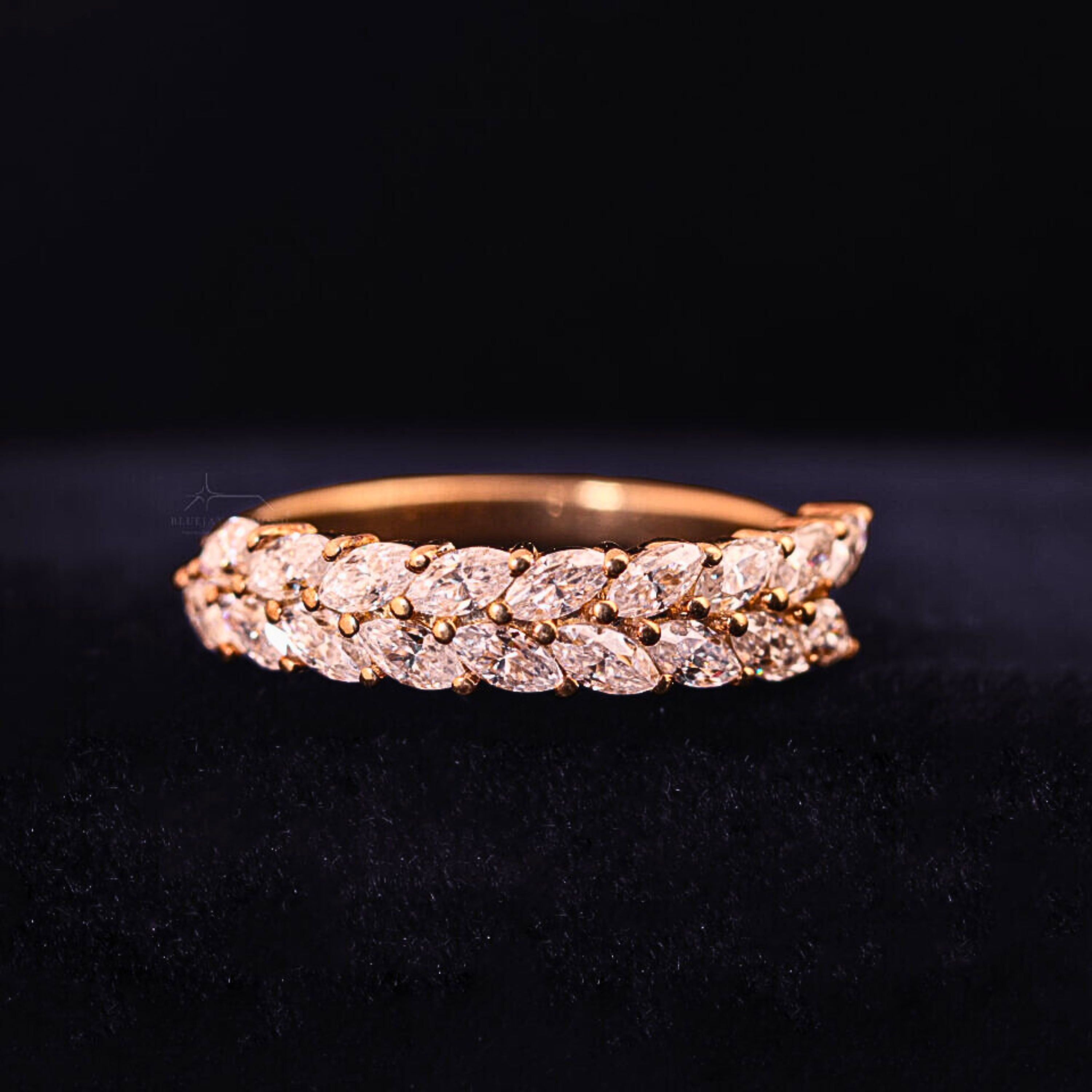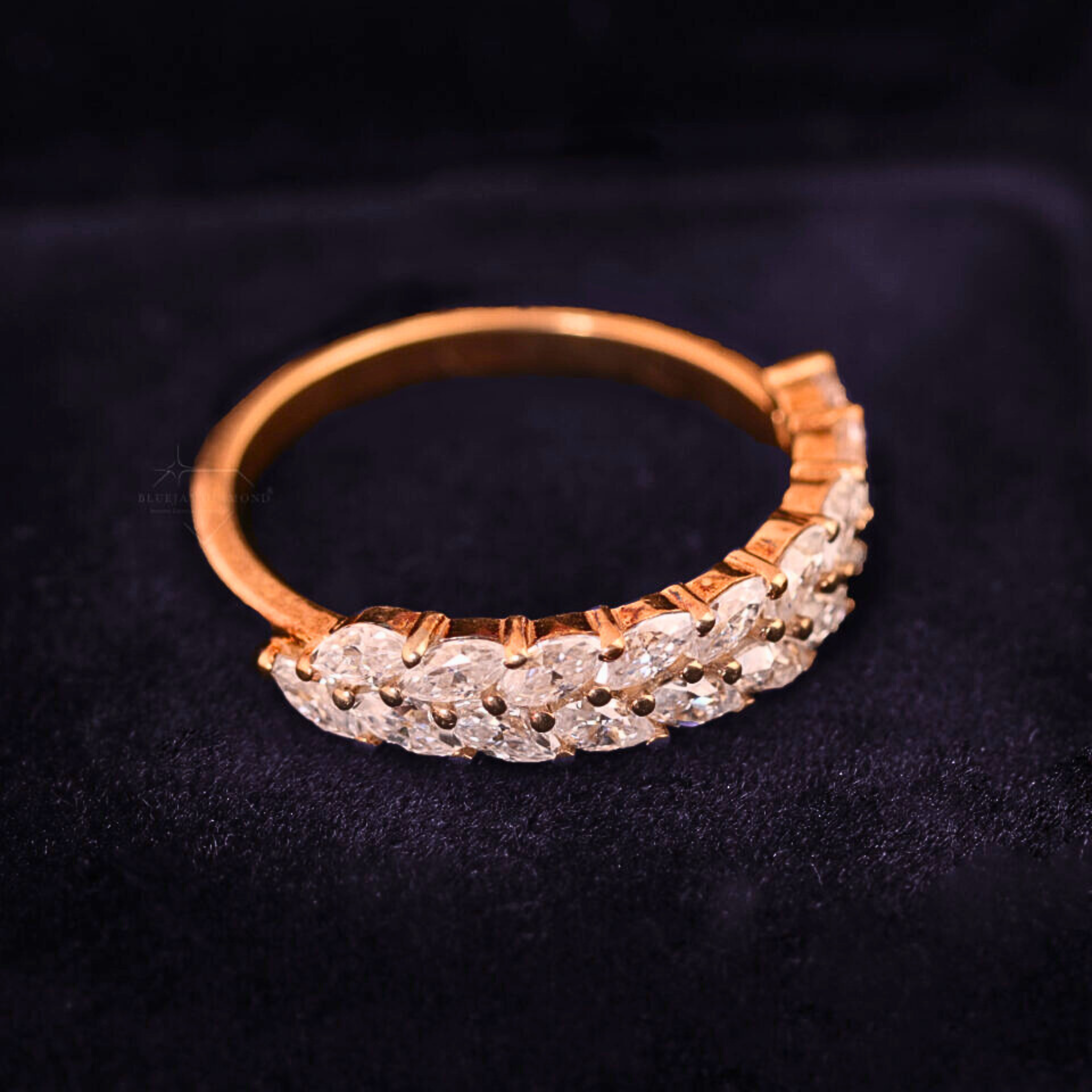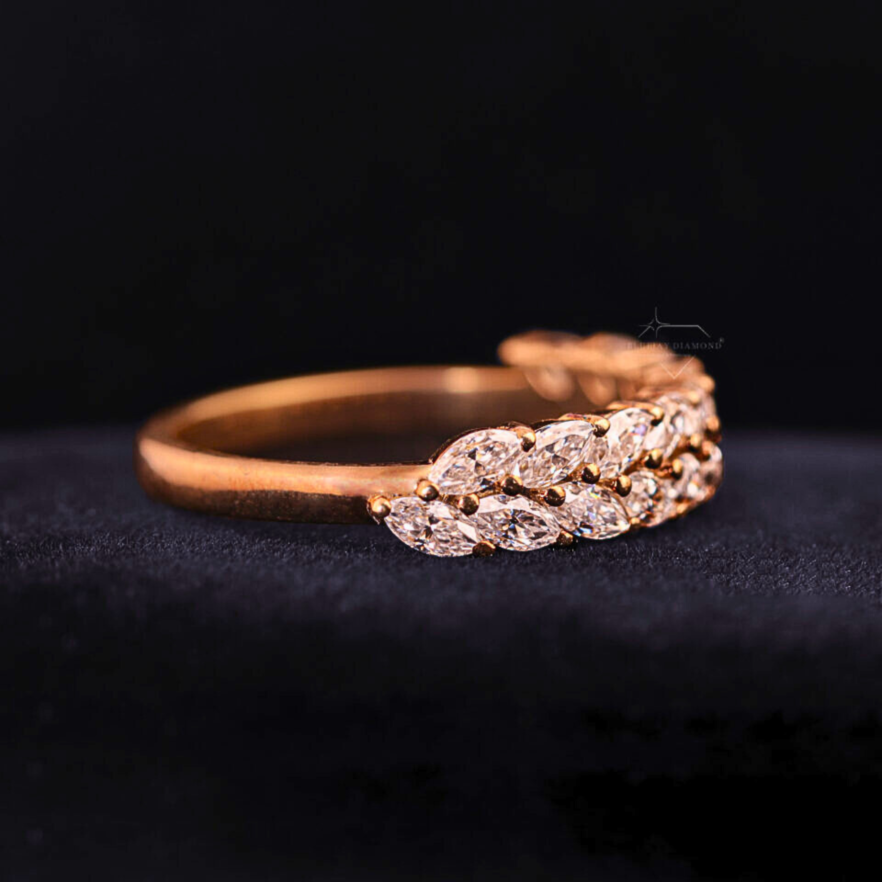 Marquise Cut Double Row Lab Grown Diamond Band crafted in solid gold with a refined luxury finish. Features 18 marquise HPHT diamonds (count may vary by ring size) totaling approx. 0.72 carat (±0.02), graded E–F color and VVS–VS clarity. Each stone is hand-set and finished with excellent polish for lasting brilliance. Available in 10KT, 14KT, or 18KT gold in yellow, white, or rose tones. Custom sizing and metal options offered. Ideal for weddings or statement stacking.