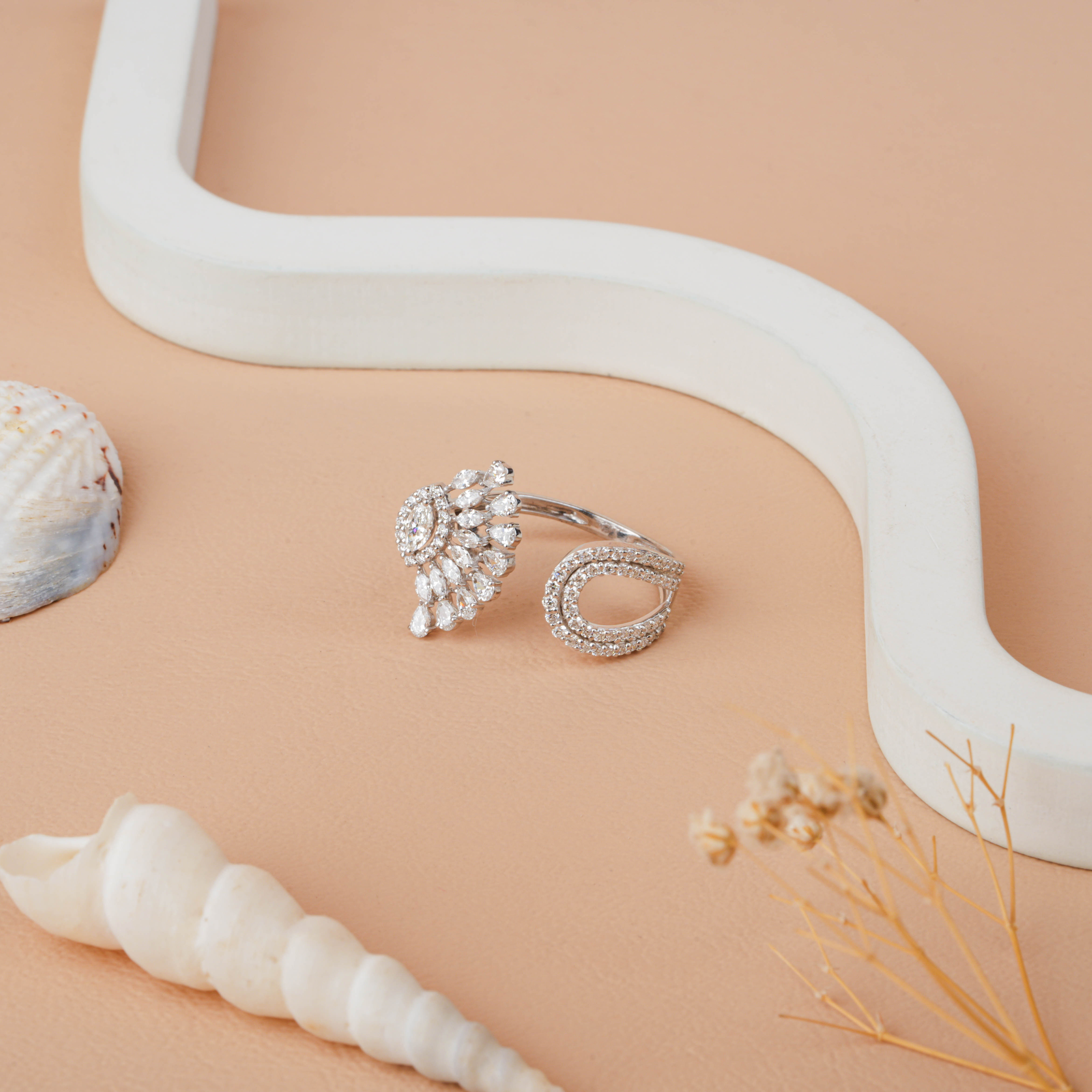 Celebrate artistry and tradition with our Peacock Heritage Adjustable Ring, inspired by the majestic beauty of India’s national bird. Sparkling pear and marquise-cut lab-grown diamonds form a graceful feathered silhouette, capturing movement, color, and timeless charm. Designed with an adjustable band, it offers a perfect fit for any wearer. Yellow, or Rose Gold, as well as Platinum, this statement ring is ideal for festive occasions, weddings, cultural celebrations