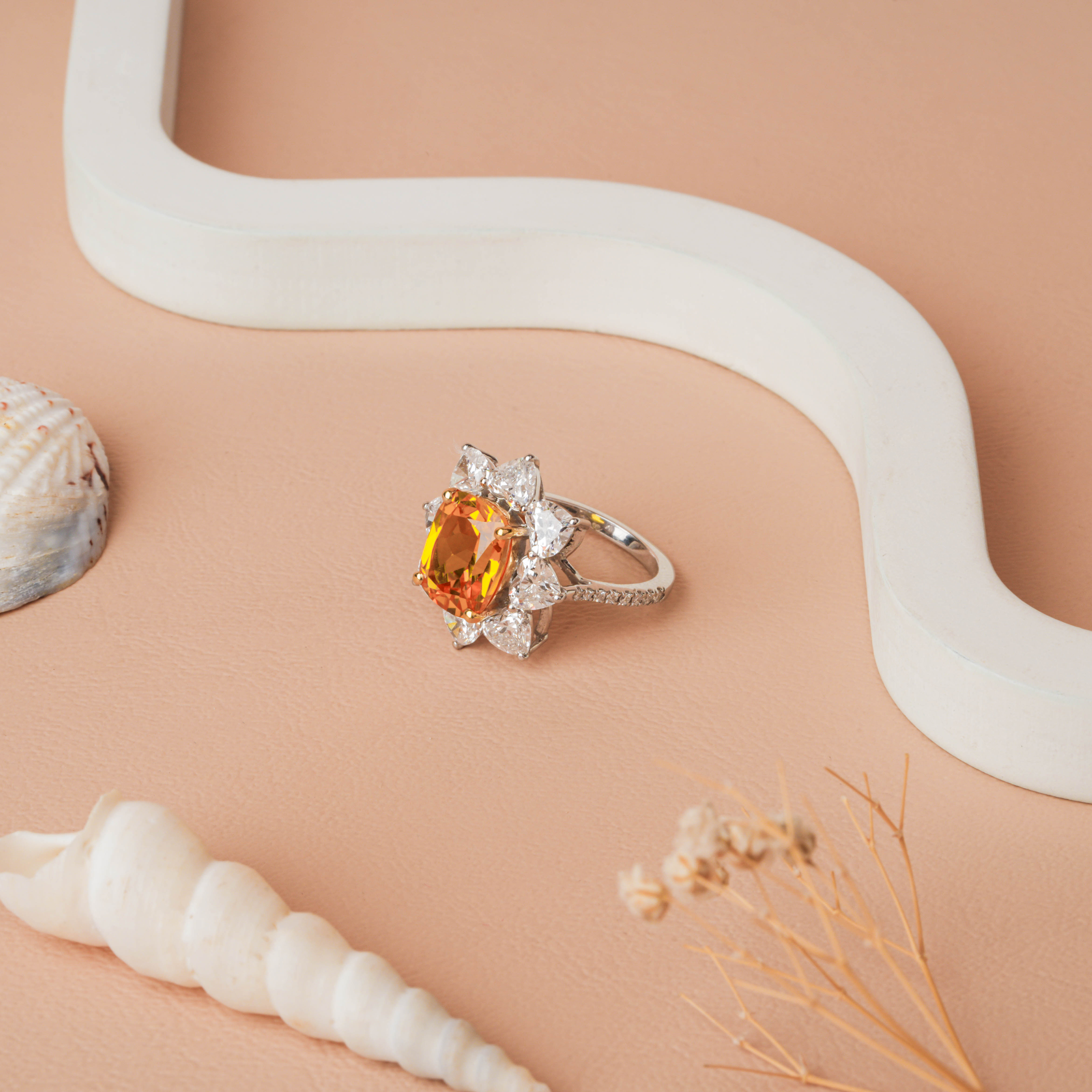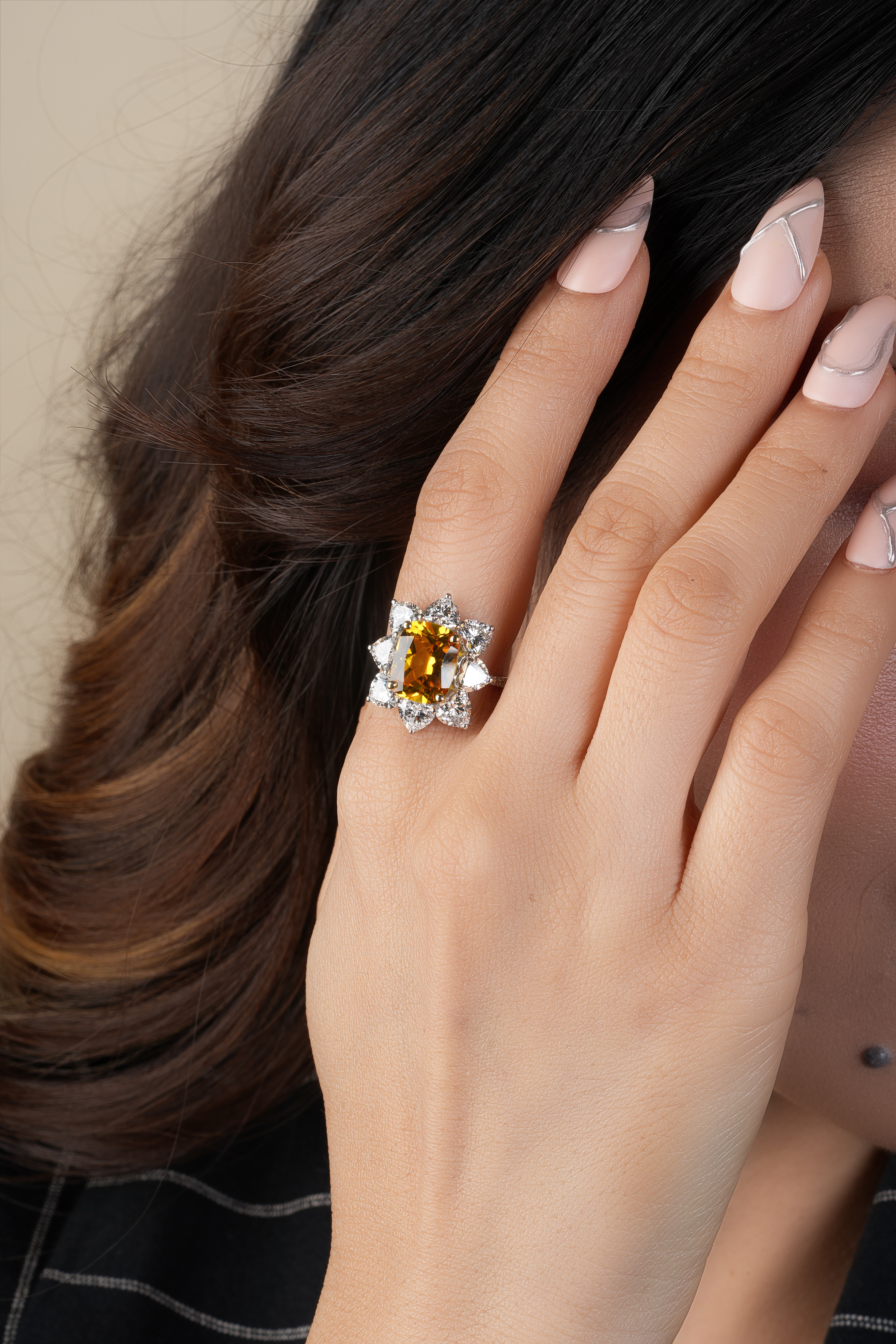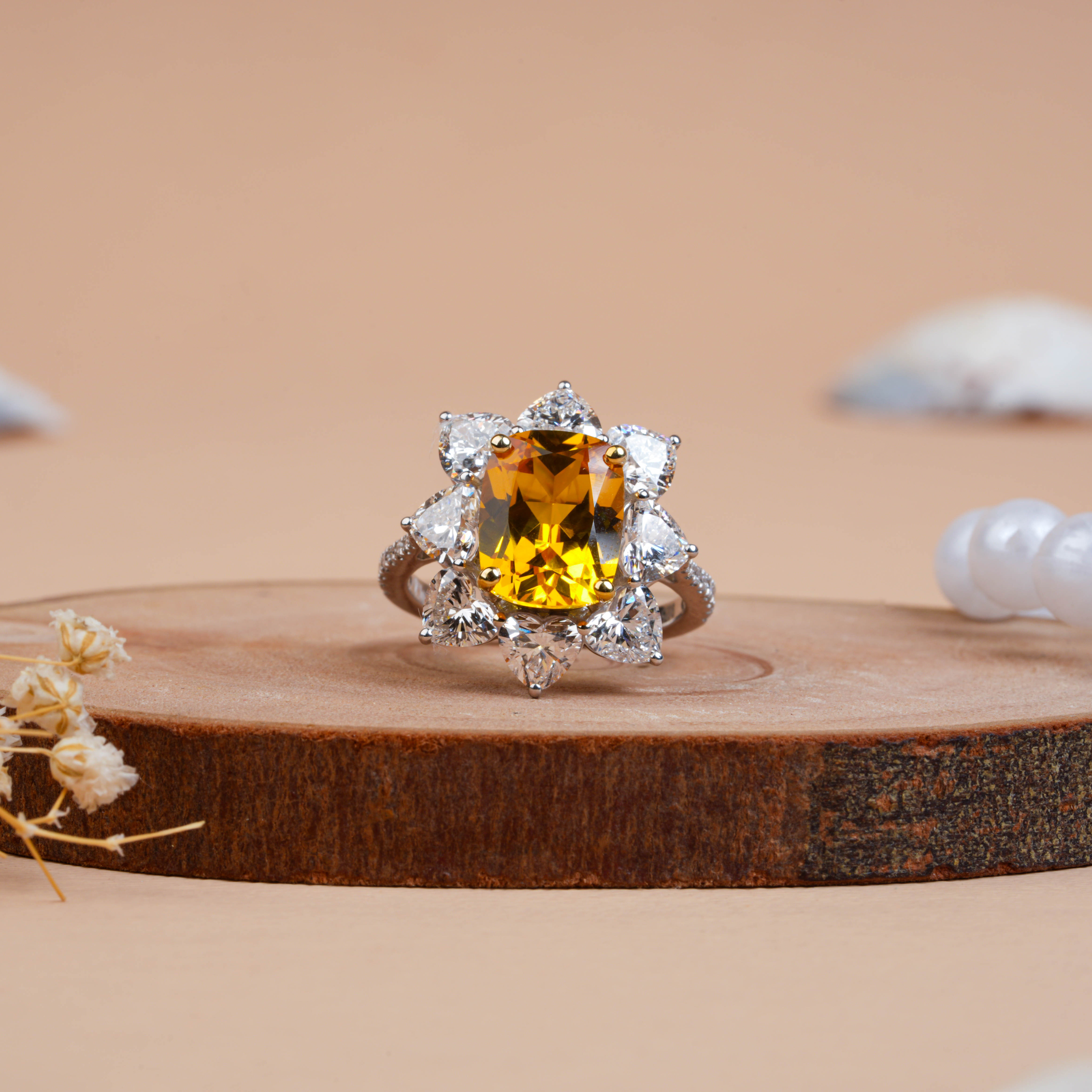 Celebrate timeless elegance with this Natural Citrine Cushion Cut Lab-Grown Diamond Halo Ring from SaffronStar.store. A radiant citrine gemstone sits at the heart, surrounded by a floral halo of heart and round-cut lab-grown diamonds — symbolizing joy and strength. Handcrafted in your choice of 14K or 18K gold or platinum, this statement ring blends sustainable luxury with modern design — perfect for engagements, anniversaries, or special occasions.