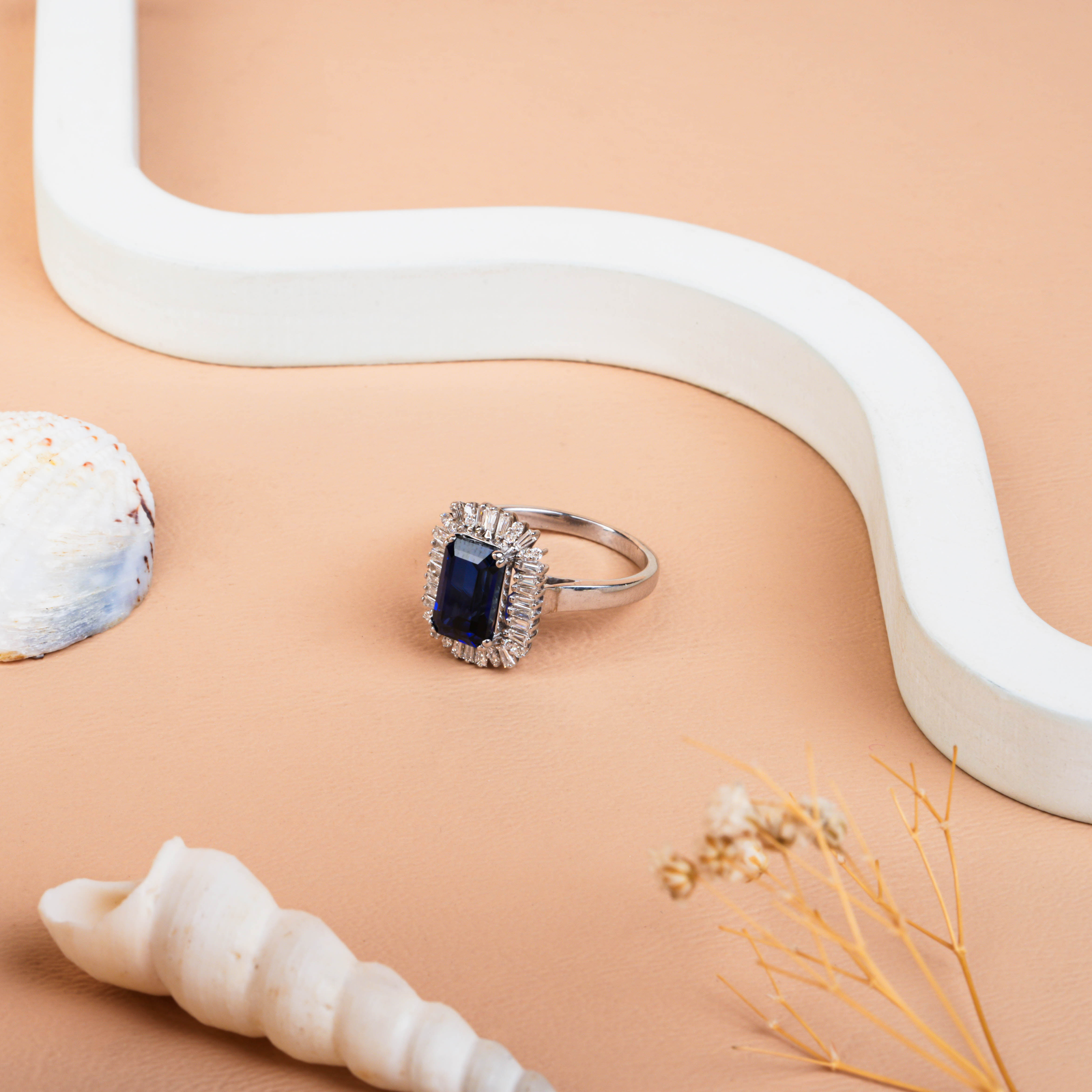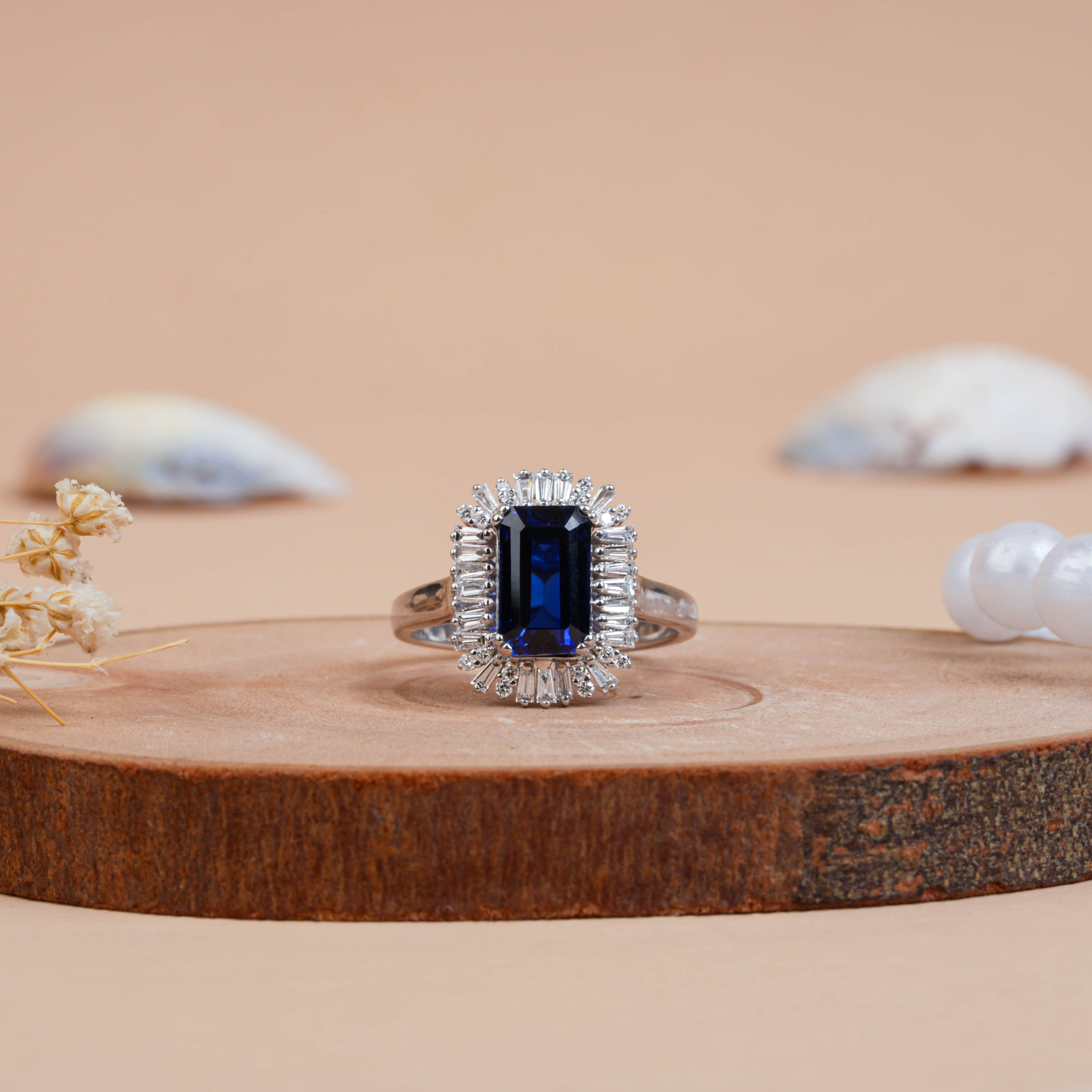 Celebrate your love with this Emerald Cut Blue Sapphire Lab-Grown Diamond Halo Engagement Ring from SaffronStar.store. A deep blue sapphire takes center stage, surrounded by a radiant halo of baguette and round-cut lab-grown diamonds. Handcrafted in 14K or 18K gold or platinum, this elegant ring symbolizes loyalty, purity, and timeless sophistication—perfect for engagements, anniversaries, or milestone celebrations.
