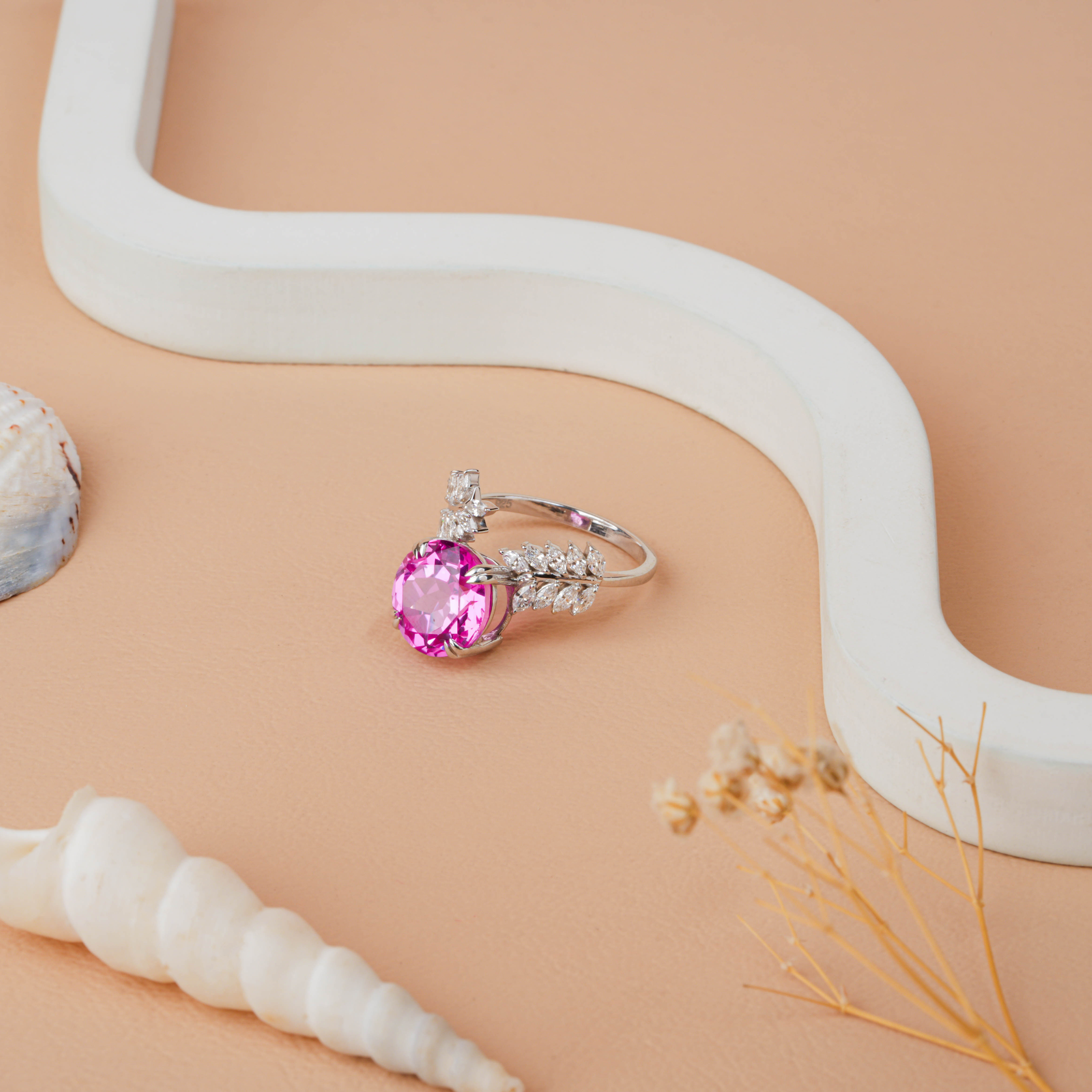 Celebrate romance with our Round Cut Pink Sapphire & Diamond Leaf Engagement Ring. A vibrant pink sapphire takes center stage, beautifully framed by sparkling lab-grown diamonds arranged in an elegant leaf pattern. Crafted in your choice of 14K–18K White, Yellow, or Rose Gold, this enchanting ring is perfect for proposals, anniversaries, or heartfelt gifts she’ll cherish forever.