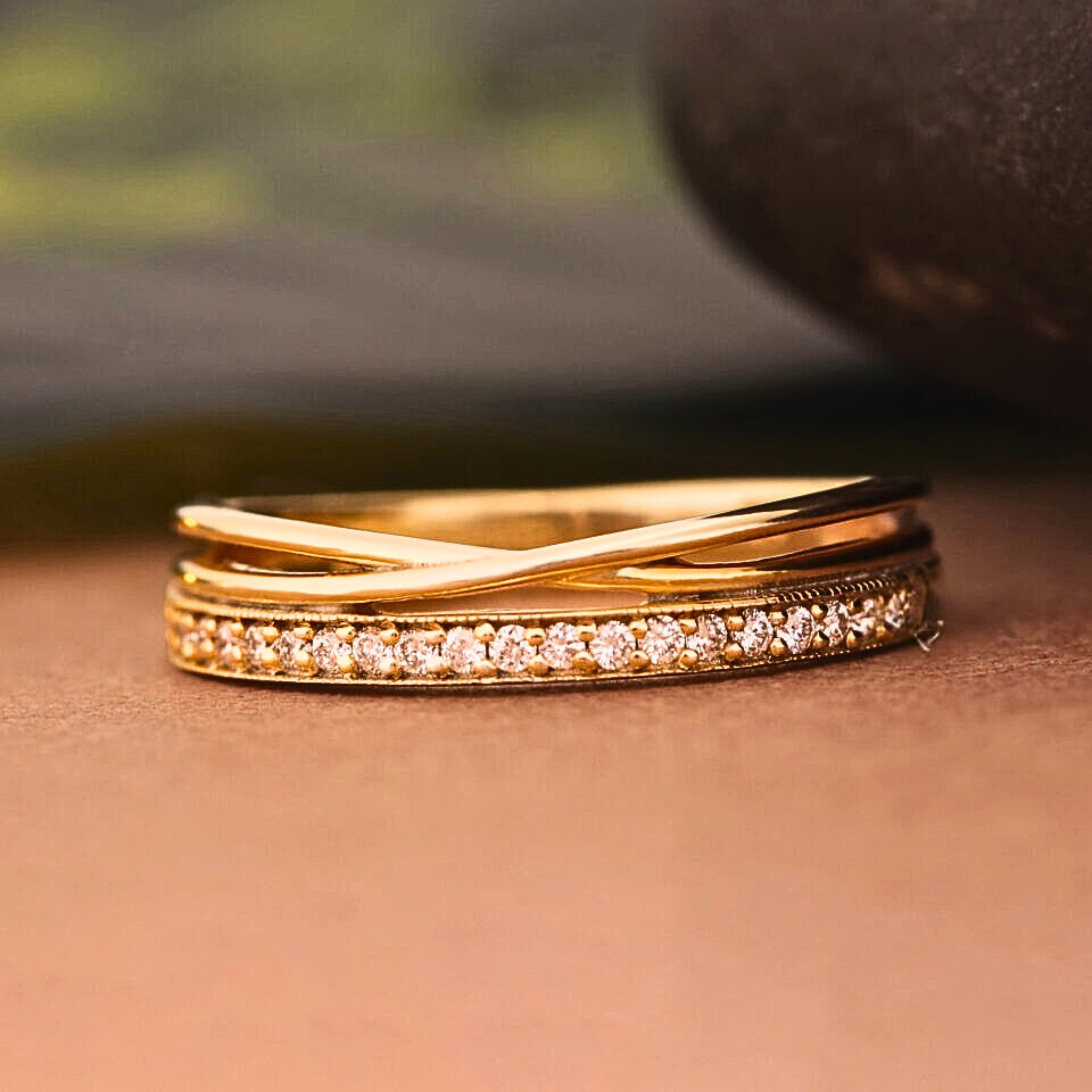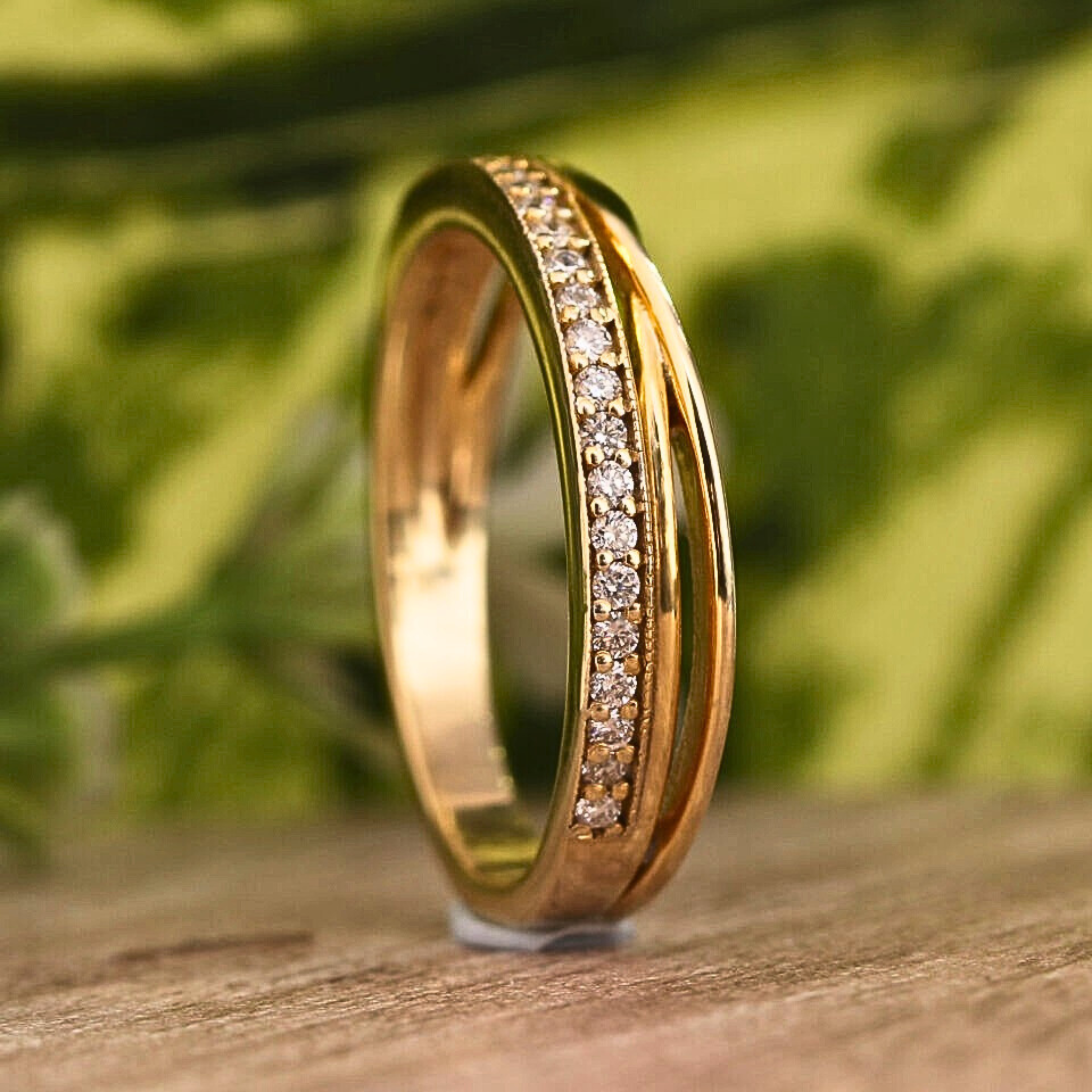 This elegant crossover ring features sparkling round cut lab grown diamonds set in a sleek channel design for a refined, modern look. Crafted in solid gold, the graceful overlapping bands add dimension and timeless appeal. Available in 10KT, 14KT, or 18KT gold with white, yellow, or rose finishes, this ring is perfect as a wedding band, anniversary gift, or everyday luxury piece. Certified and hallmarked for authenticity.