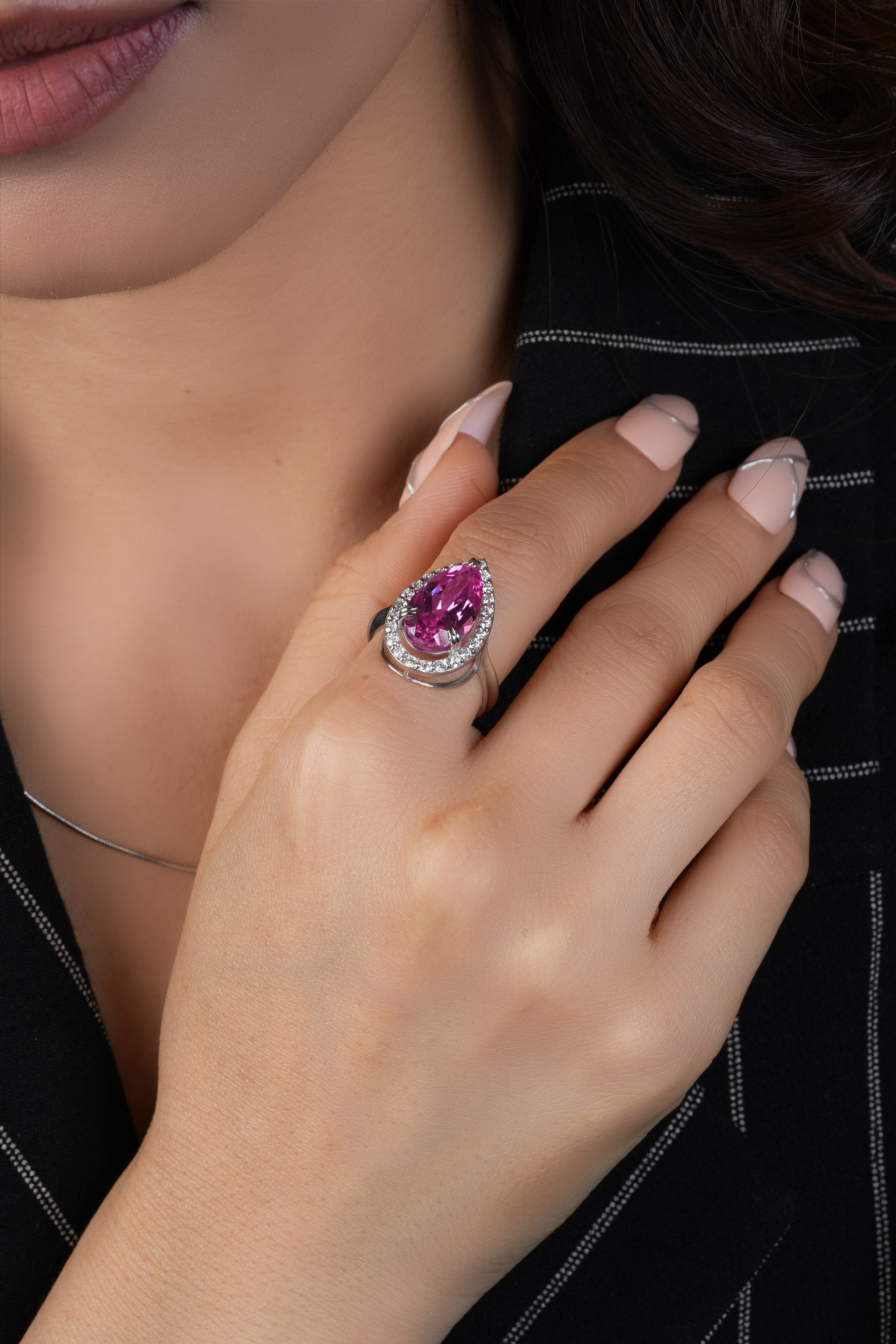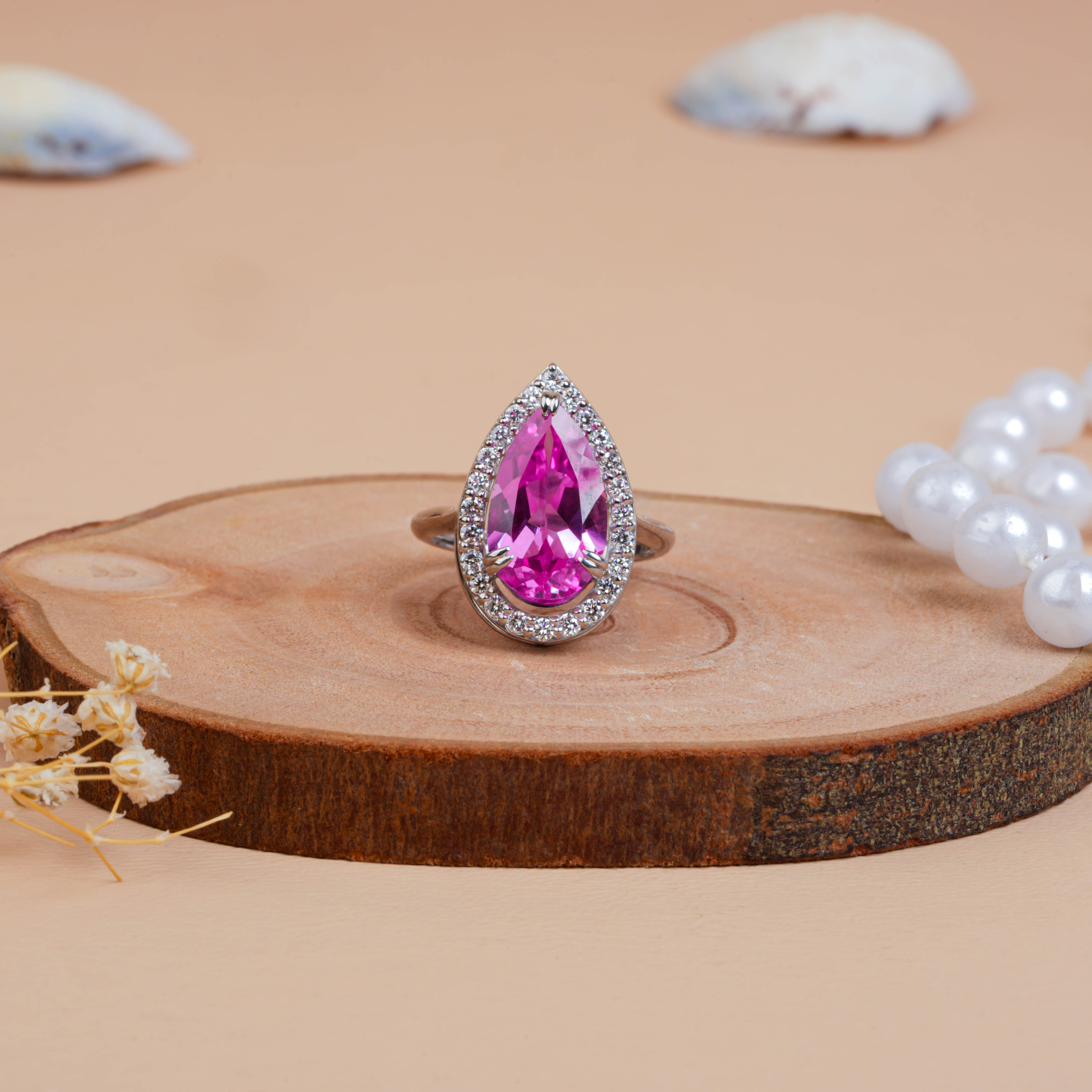 Celebrate timeless romance with the Pear Cut Halo Pink Sapphire & Diamond Engagement Ring.A radiant pear-cut pink sapphire shines at the center, encircled by a sparkling halo of lab-grown diamonds that enhances its brilliance. Handcrafted in 14K or 18K Rose, White, or Yellow Gold, or Platinum, this ring is a breathtaking choice for engagements, anniversaries, or memorable celebrations.