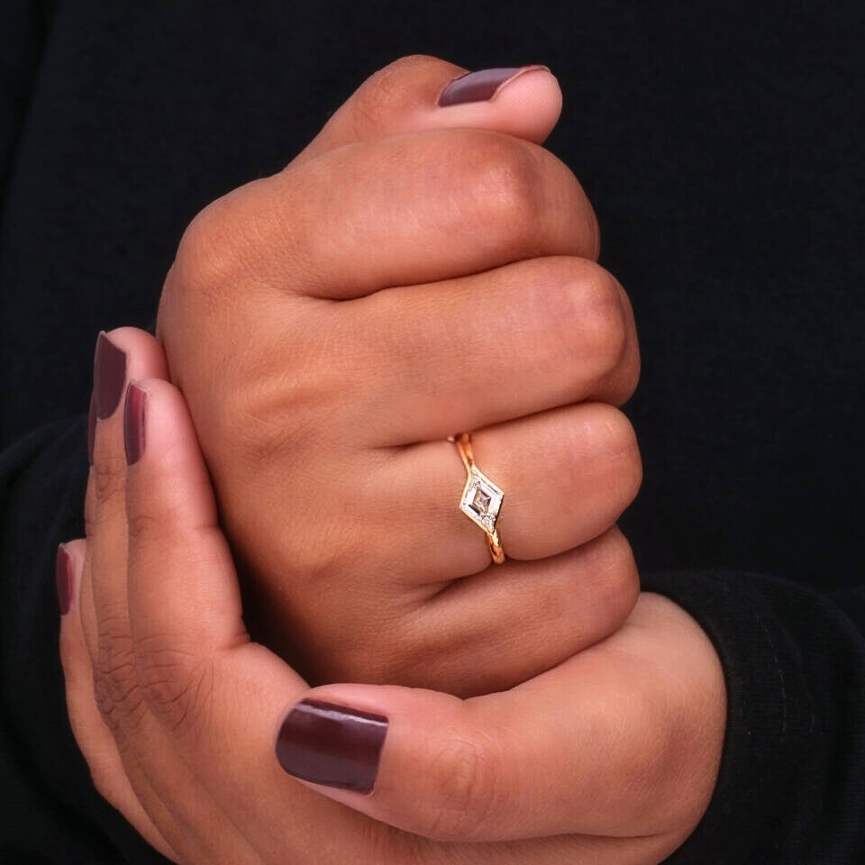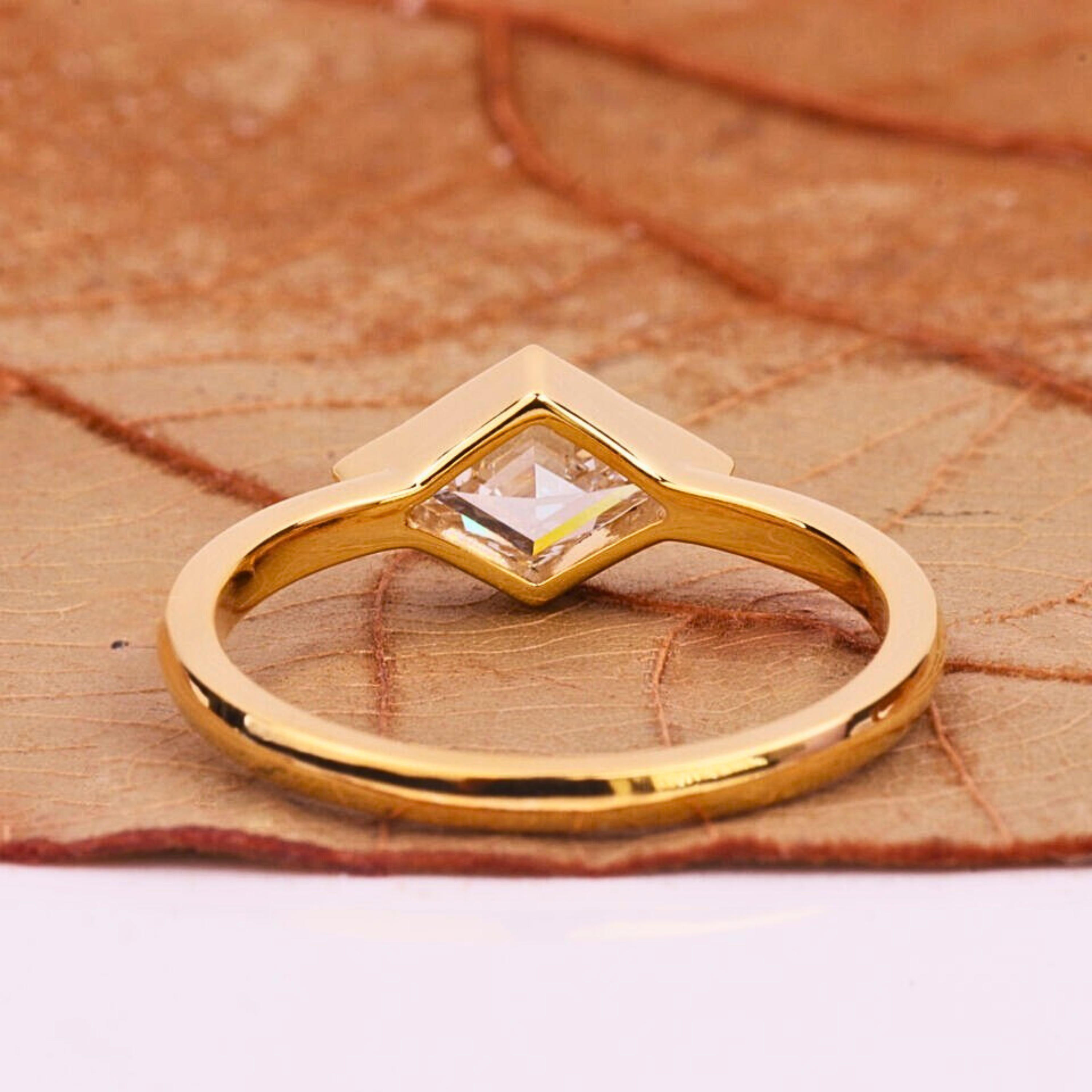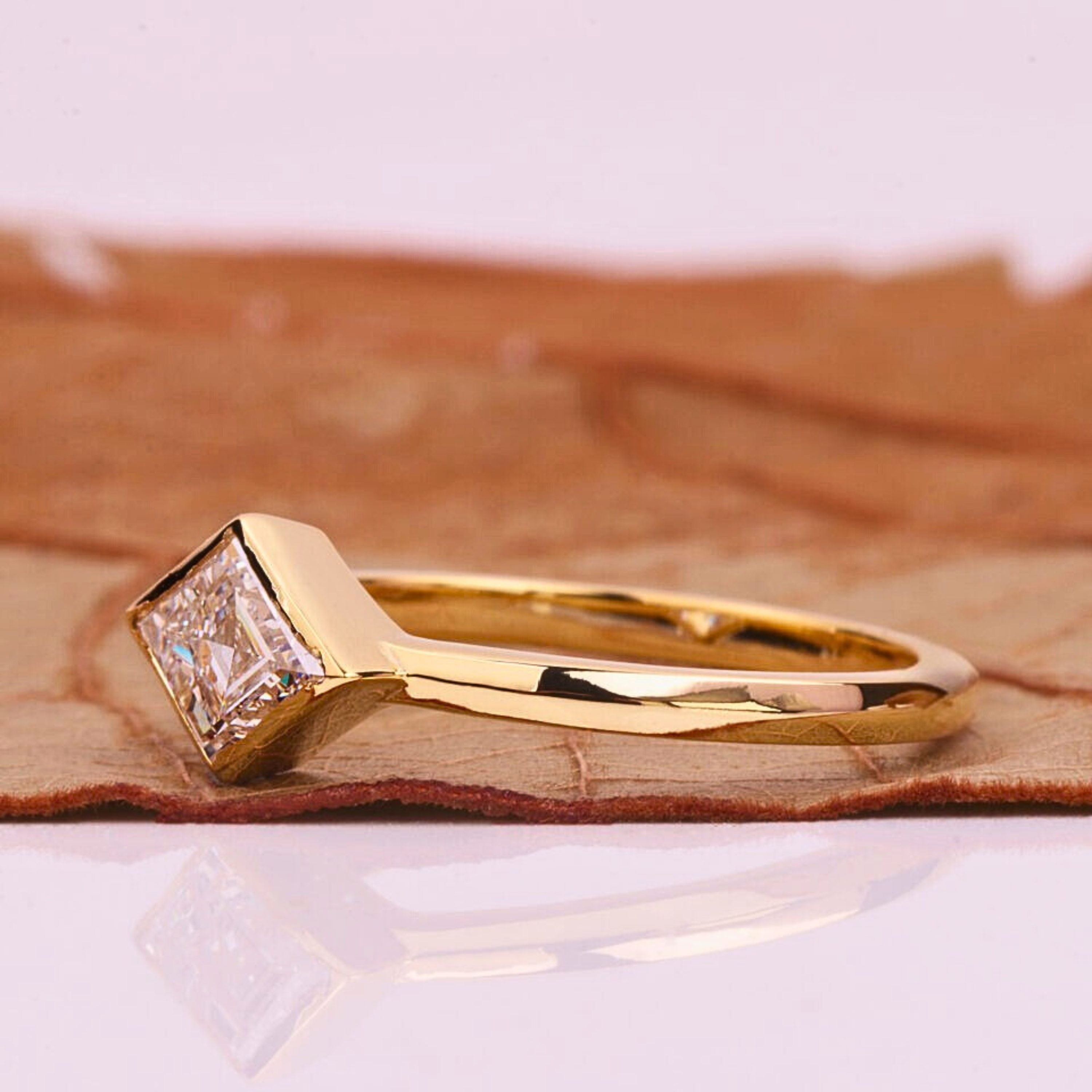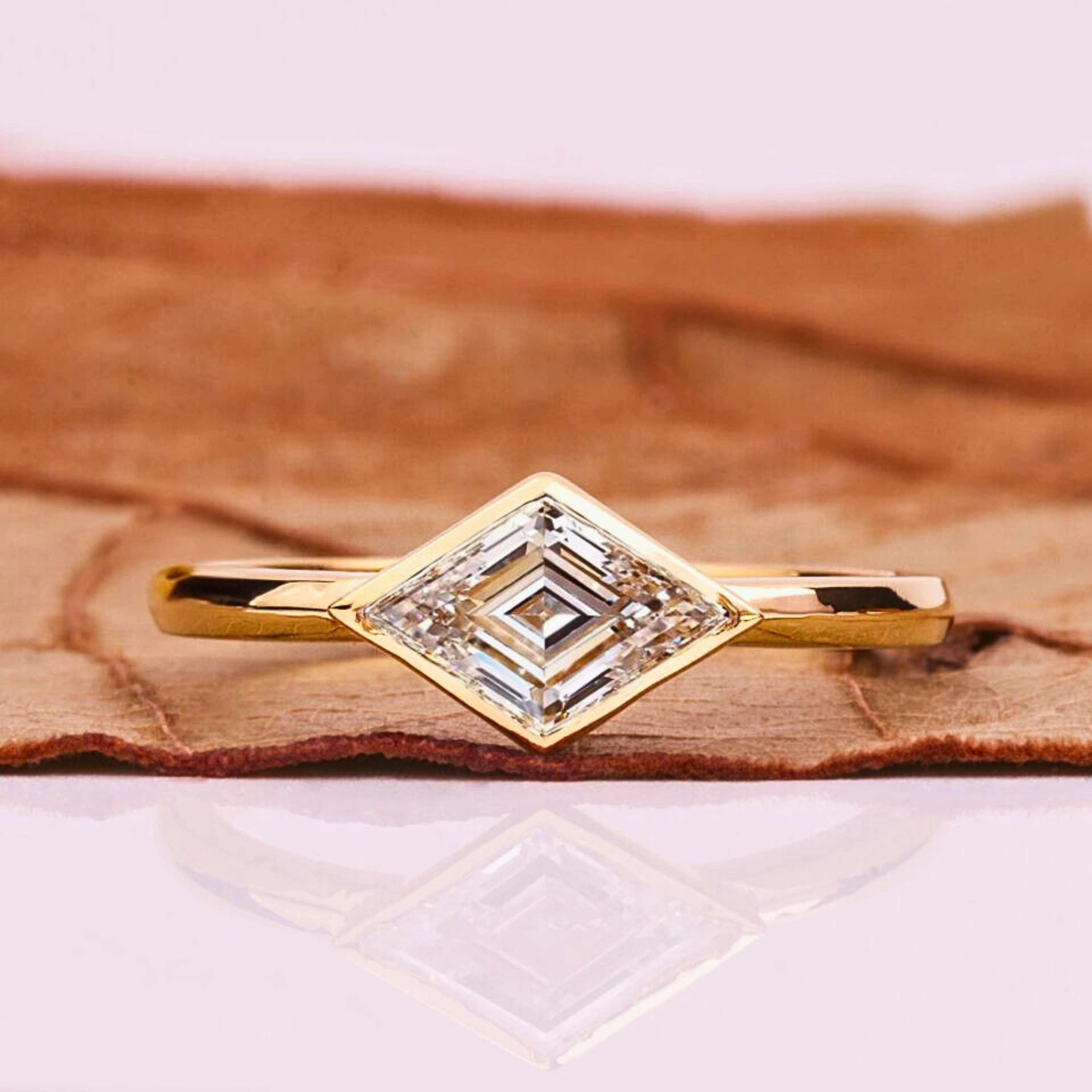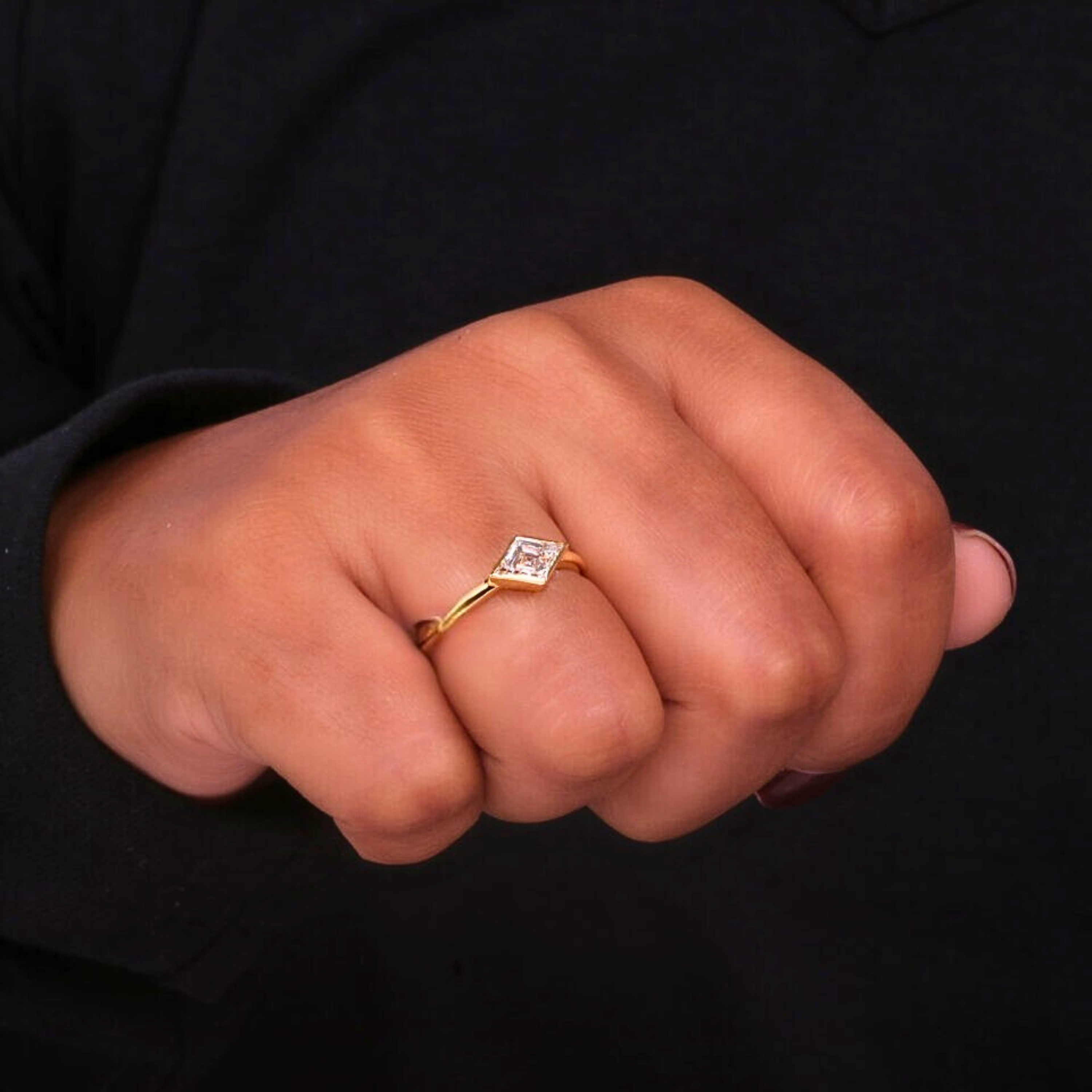 This elegant East-West lozenge cut lab grown diamond solitaire ring features a sleek bezel setting that highlights the diamond’s clean geometry and modern brilliance. Crafted in solid gold, the slim band offers a refined and comfortable fit for everyday wear. Available in multiple carat options and gold tones, this timeless yet contemporary design is perfect for engagements, anniversaries, or minimalist luxury styling.