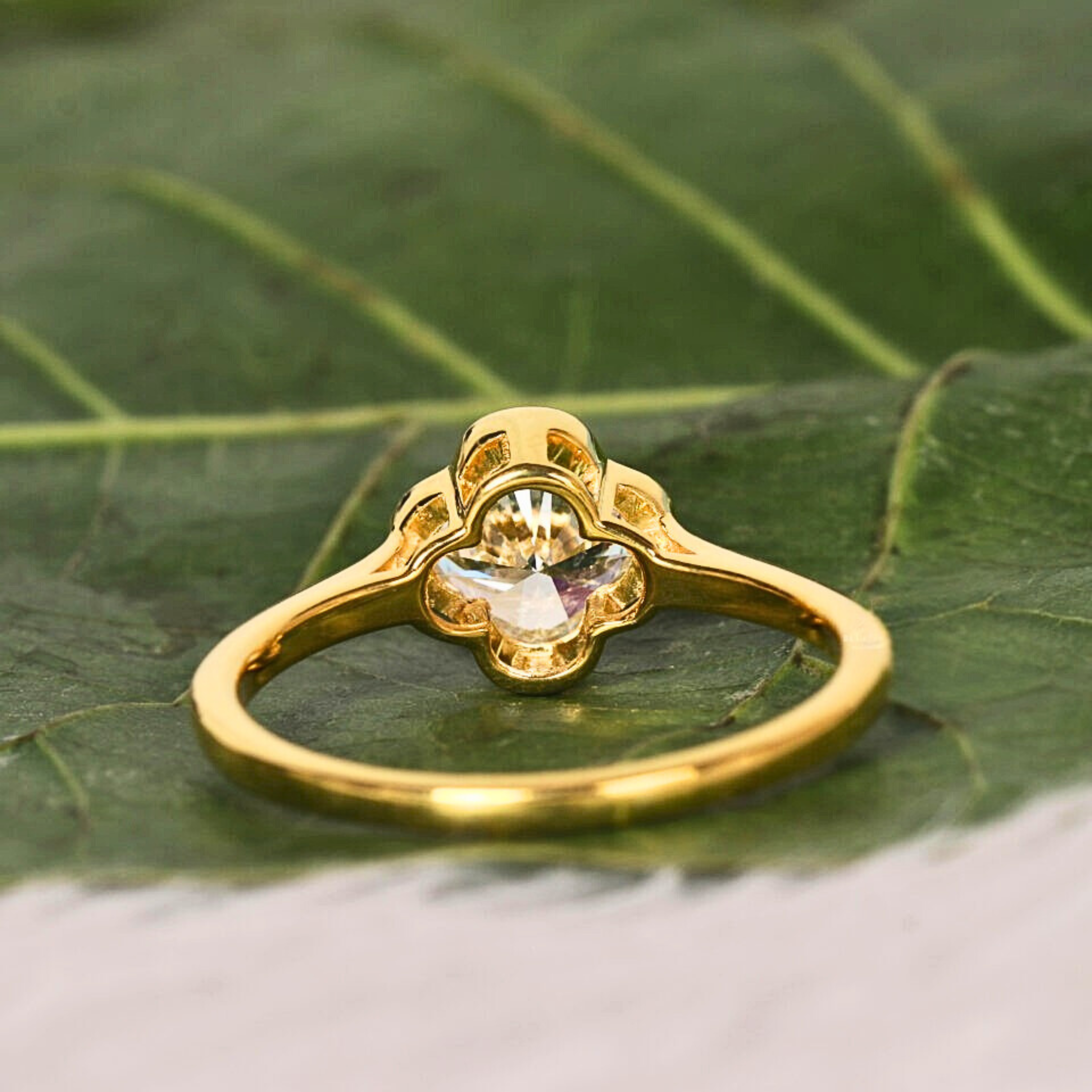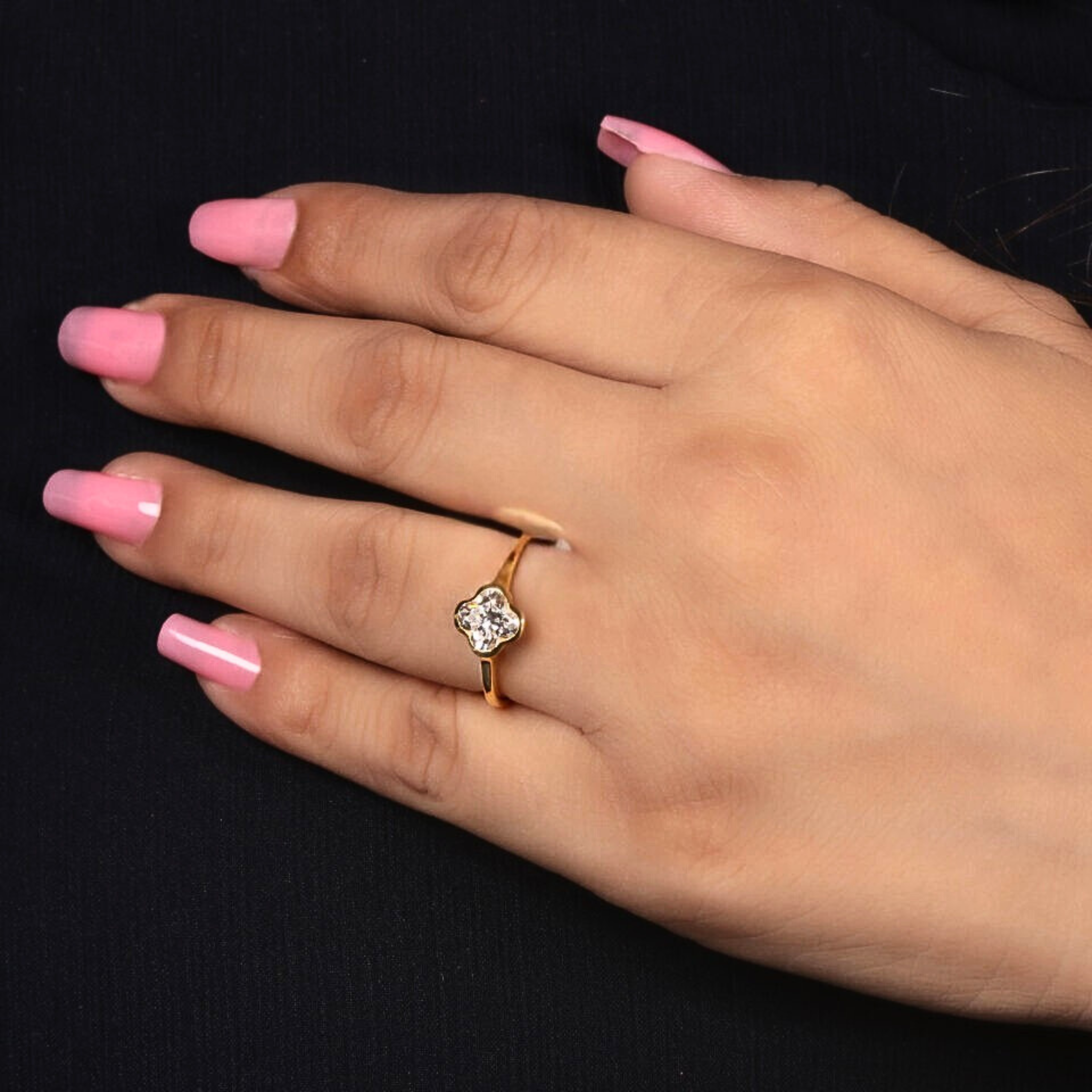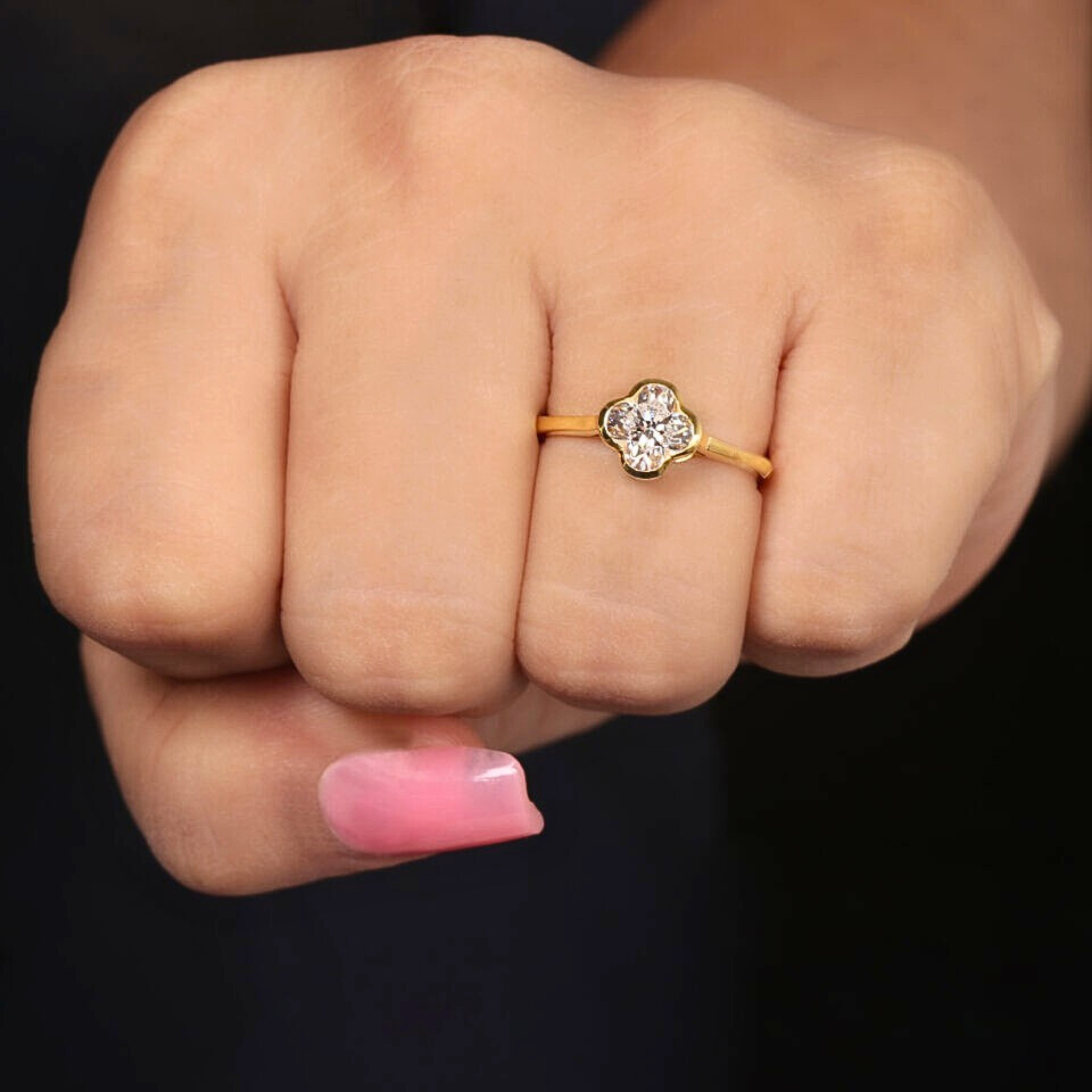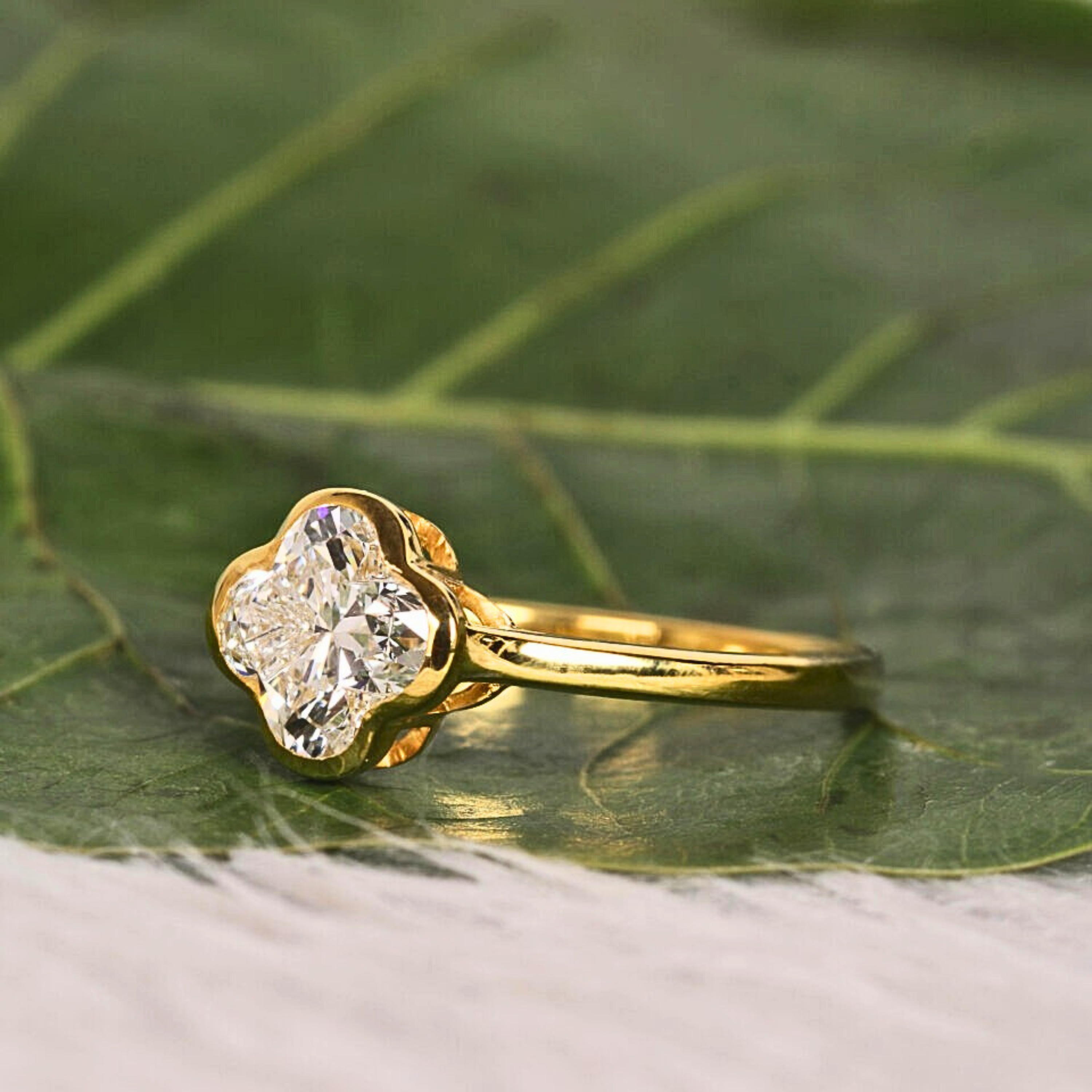 Celebrate timeless elegance with this Lily Cut lab grown diamond clover ring, crafted in a sleek bezel setting. Featuring a brilliant 1.00 CT diamond with DE color and VVS–VS clarity, the floral-inspired design offers a modern yet romantic look. Made in solid 10KT, 14KT, or 18KT yellow gold, this handcrafted ring is perfect for engagements, anniversaries, or everyday luxury. Comes with a certified lab grown diamond for assured quality and brilliance.