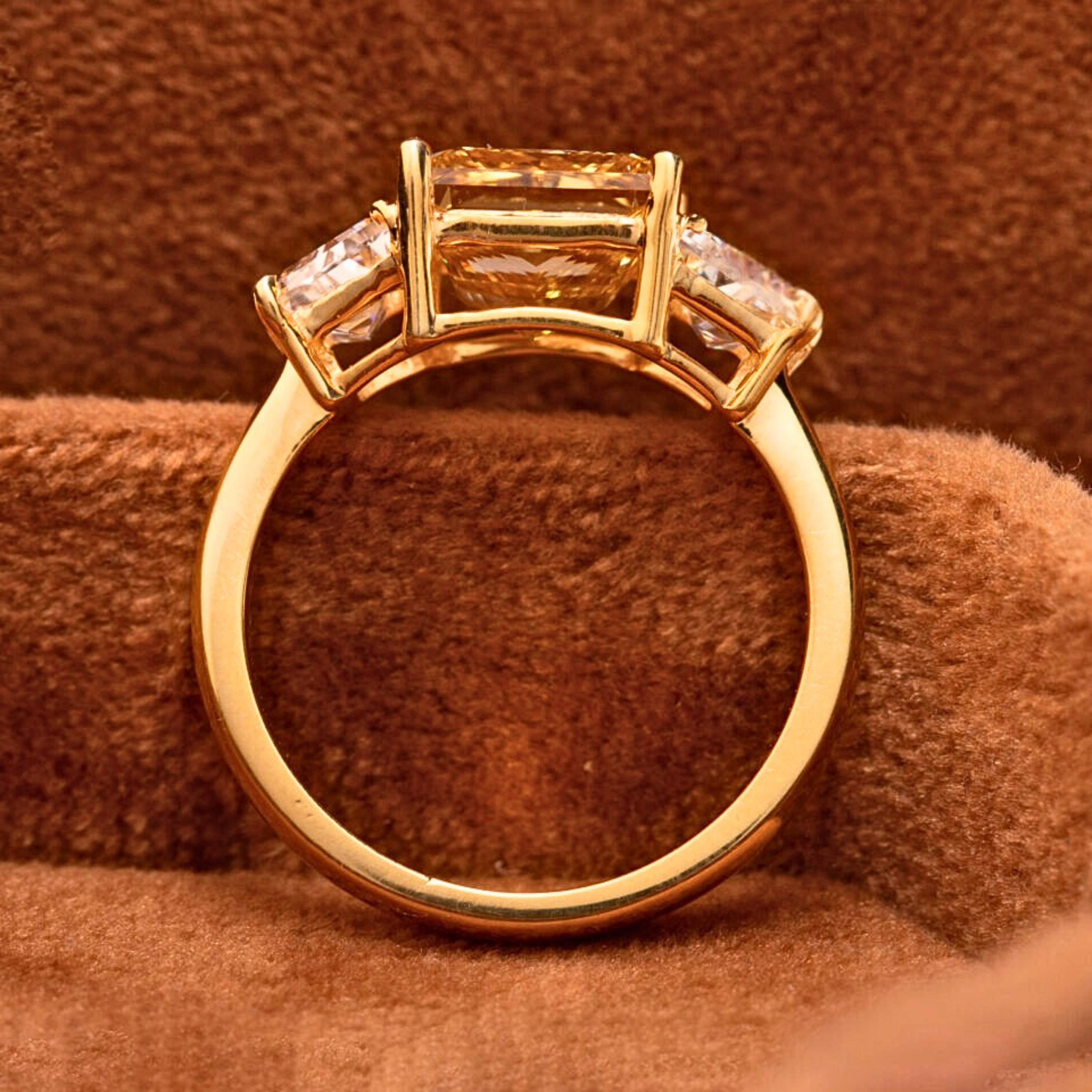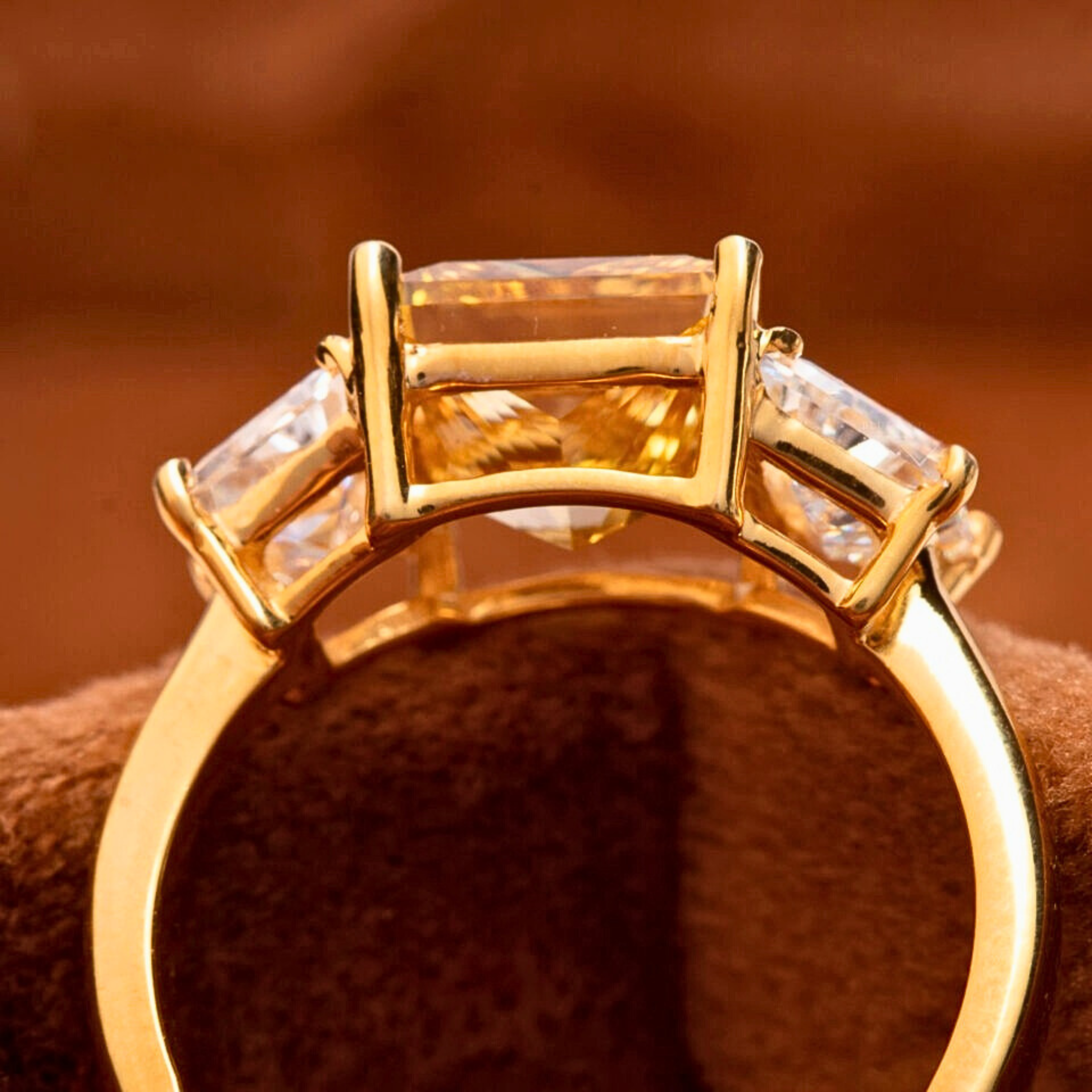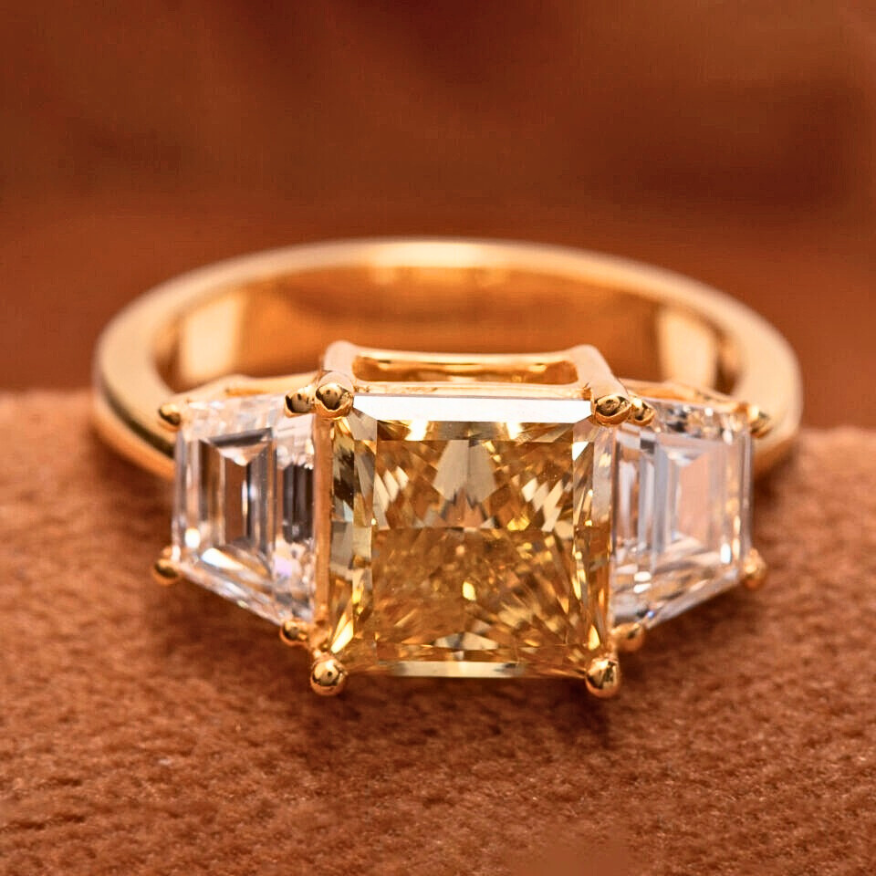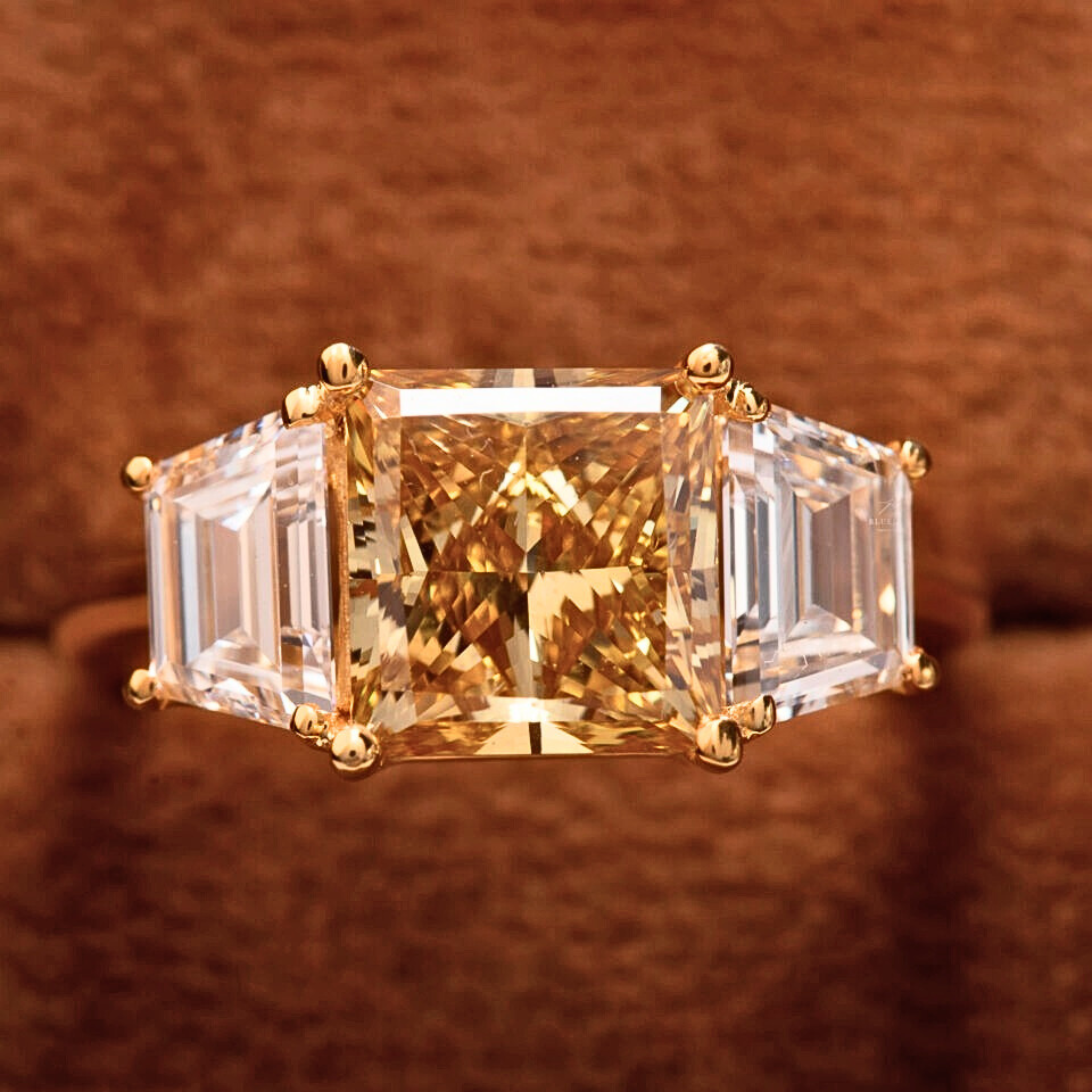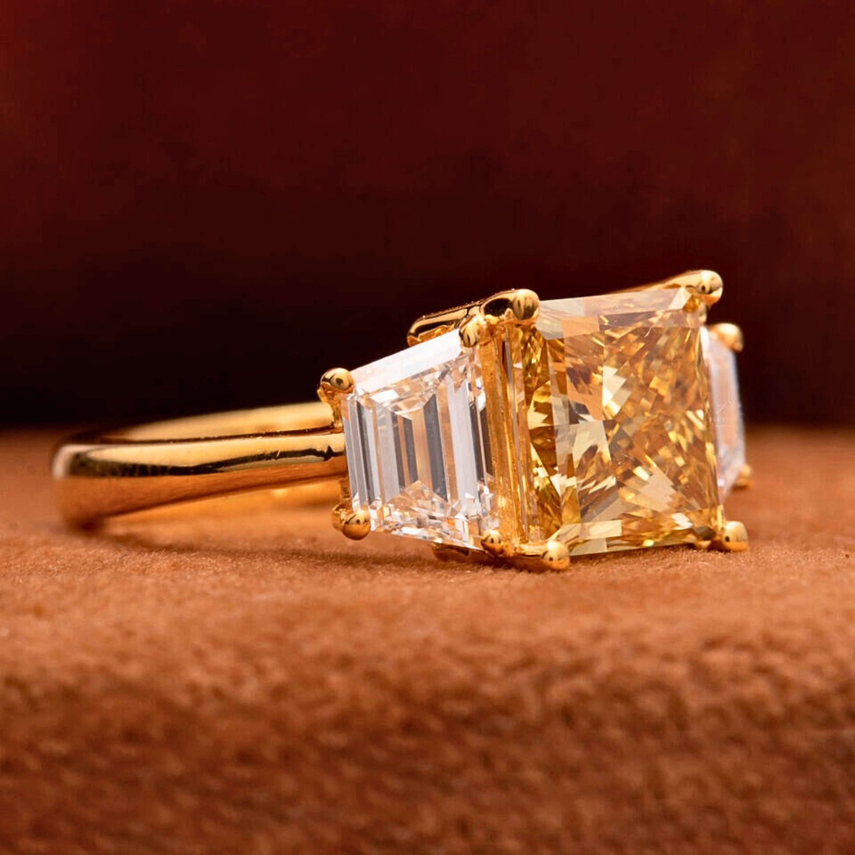 Make a bold and elegant statement with this Yellow Princess Cut Lab Grown Diamond Engagement Ring, featuring a breathtaking 3.02 CT fancy yellow center diamond. Accented by precision-cut trapezoid and triangle lab grown diamonds, this three-stone design symbolizes the past, present, and future of your love. Expertly set in solid gold (10KT, 14KT, or 18KT), this ring delivers exceptional brilliance, ethical sourcing, and timeless luxury—perfect for a modern yet sophisticated engagement.