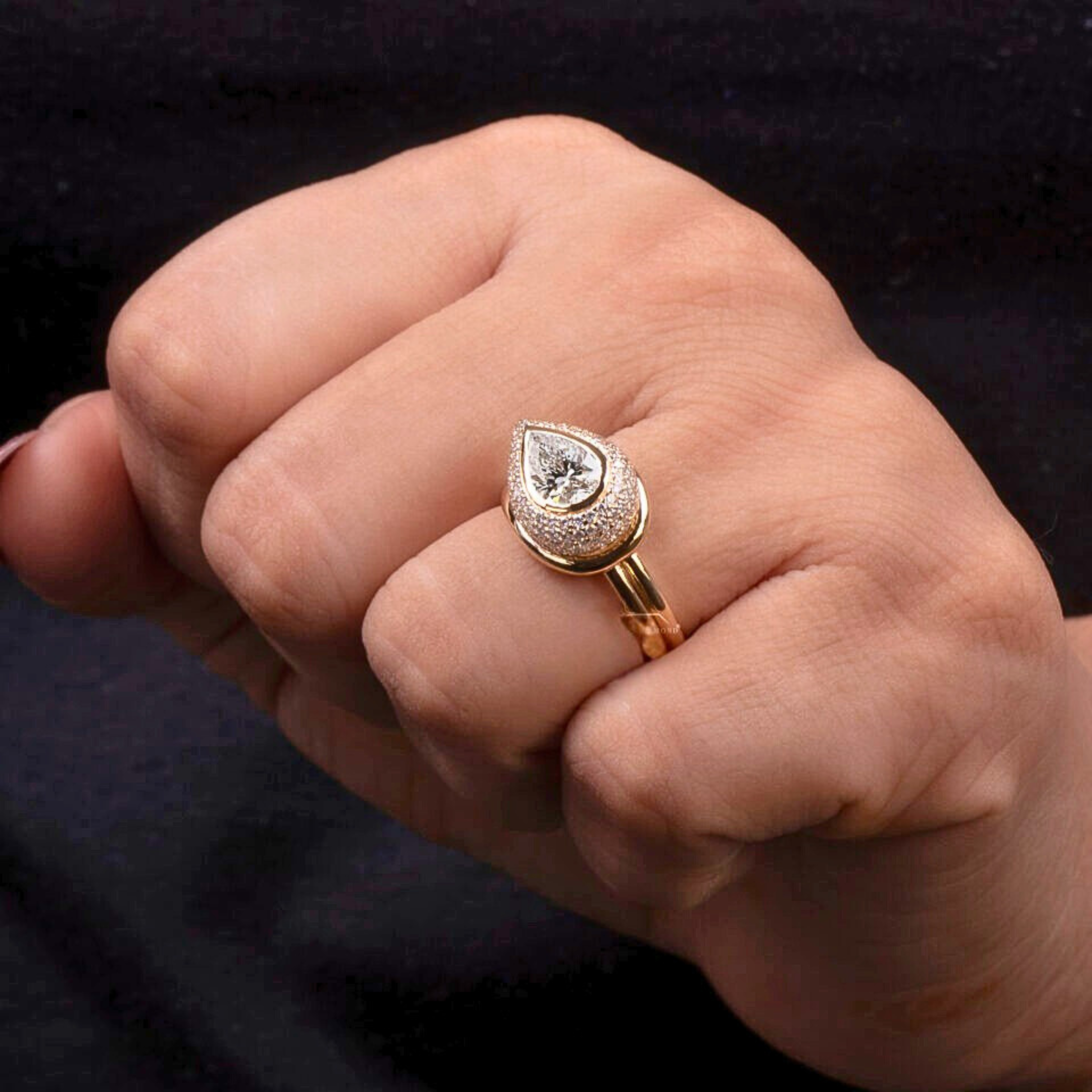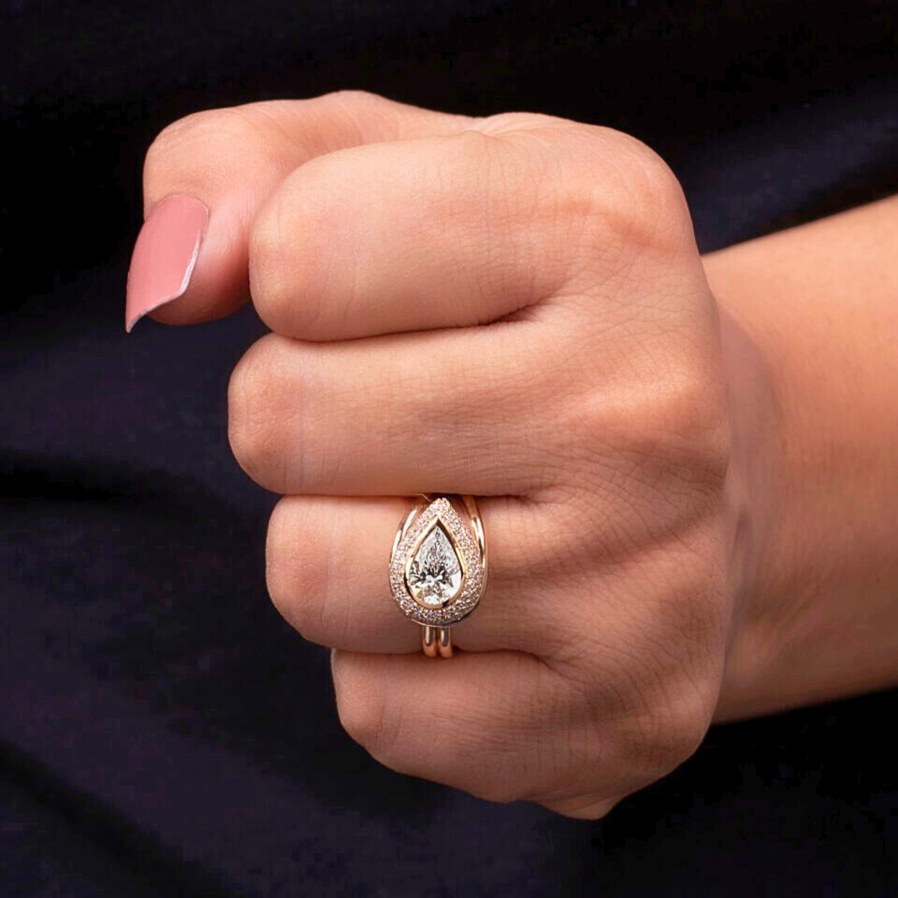 Elevate your style with this Pear-Shaped Lab Grown Diamond Double Halo Ring, featuring a brilliant 1.00 CT D/VVS2 pear cut diamond embraced by a dazzling double halo of round lab grown diamonds. Crafted in solid gold, the elegant teardrop silhouette offers exceptional sparkle and modern sophistication. A perfect choice for engagements, anniversaries, or statement luxury jewelry.