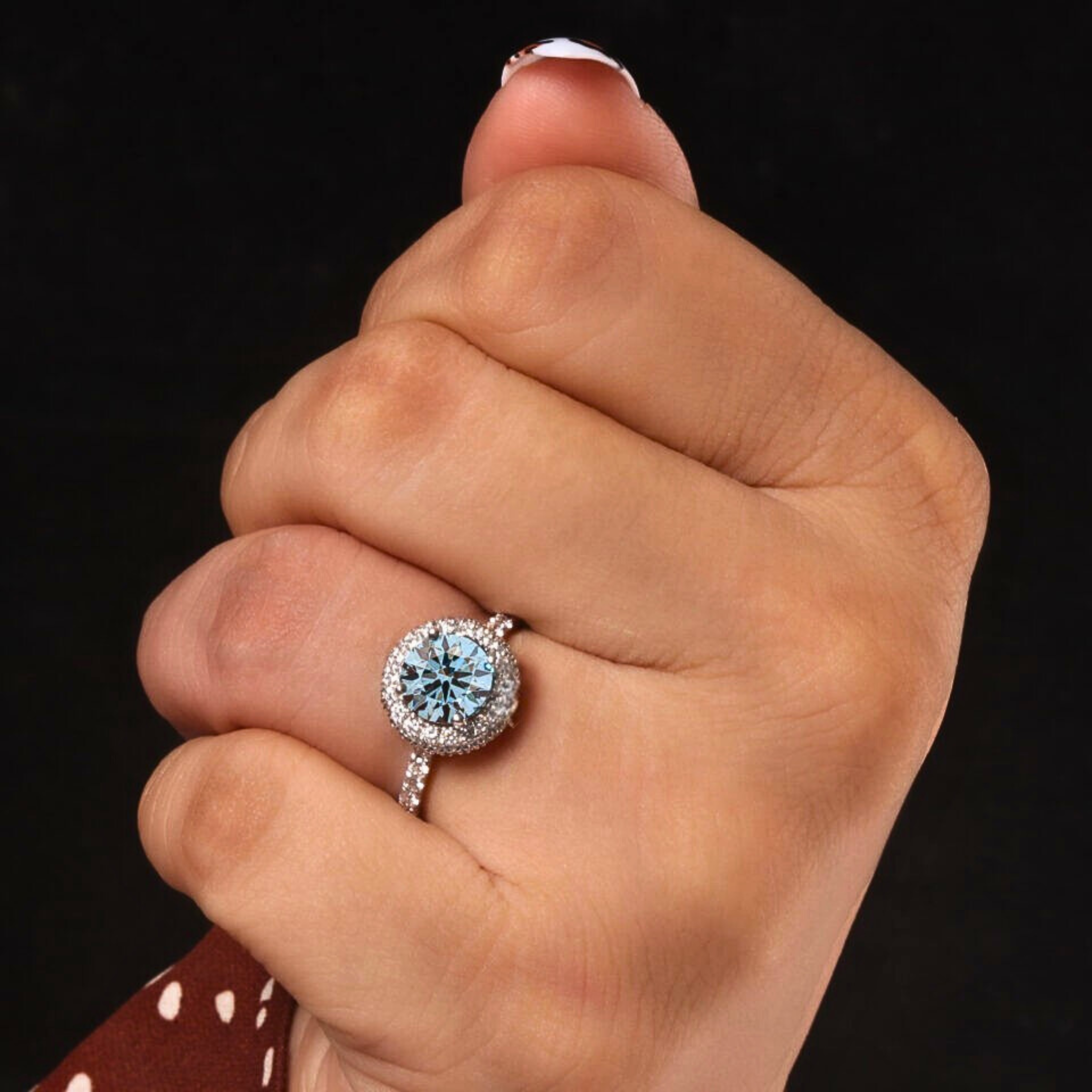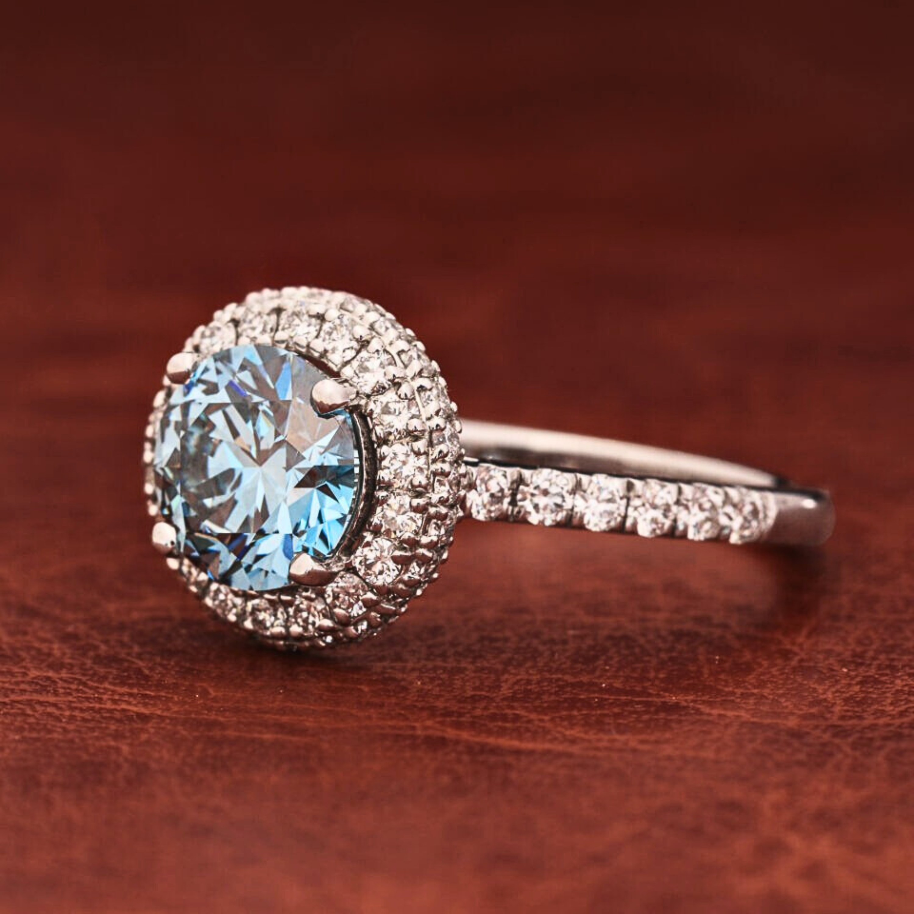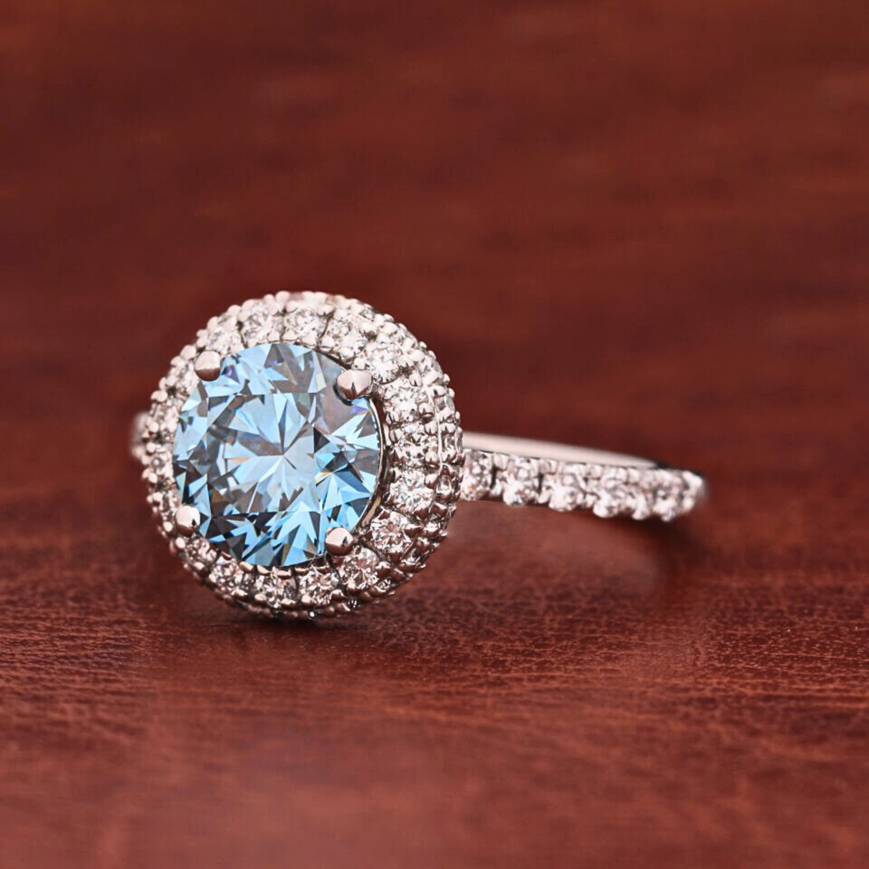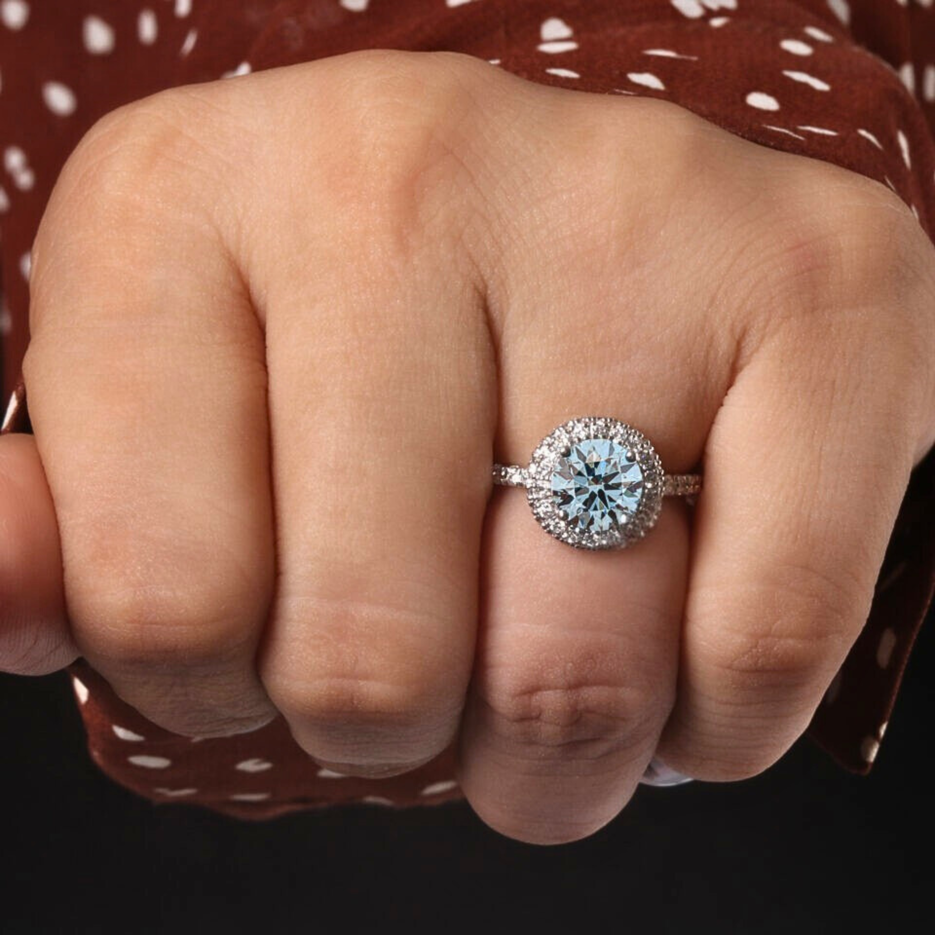 Make a bold and timeless statement with this Blue Round Cut Lab Grown Diamond Halo Engagement Ring, featuring a dazzling 1.50 CT vivid blue center diamond surrounded by a sparkling halo of round lab grown diamonds. The pavé-set band adds continuous brilliance, enhancing the ring’s luxurious presence from every angle. Crafted in solid 10KT, 14KT or 18KT gold.