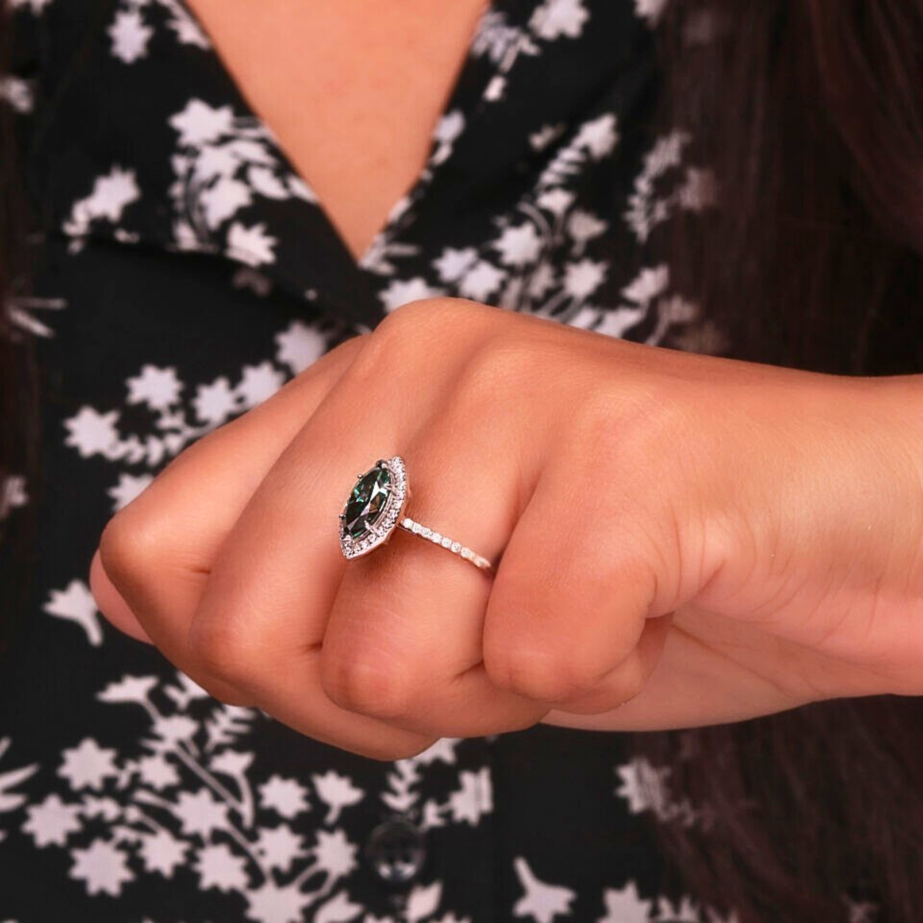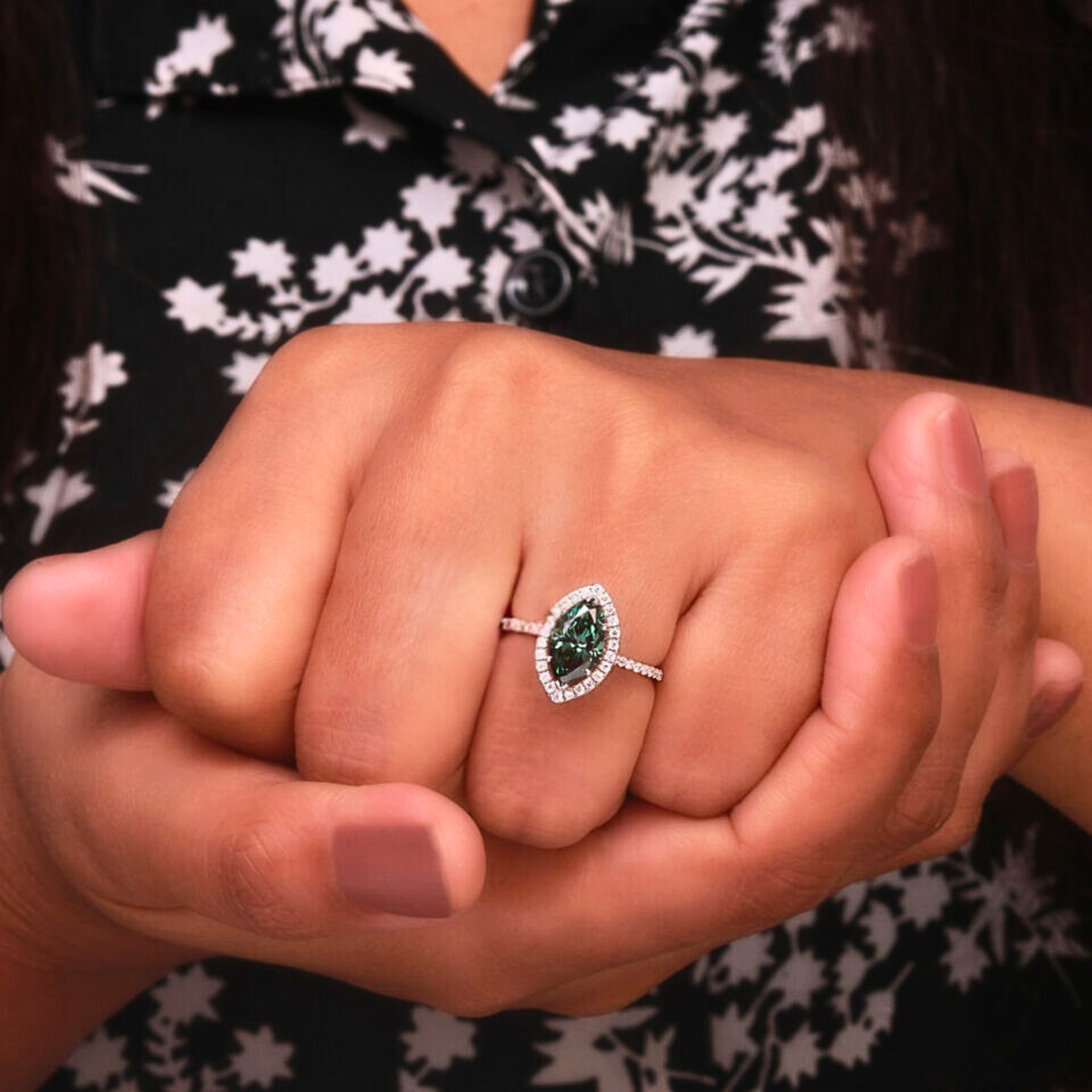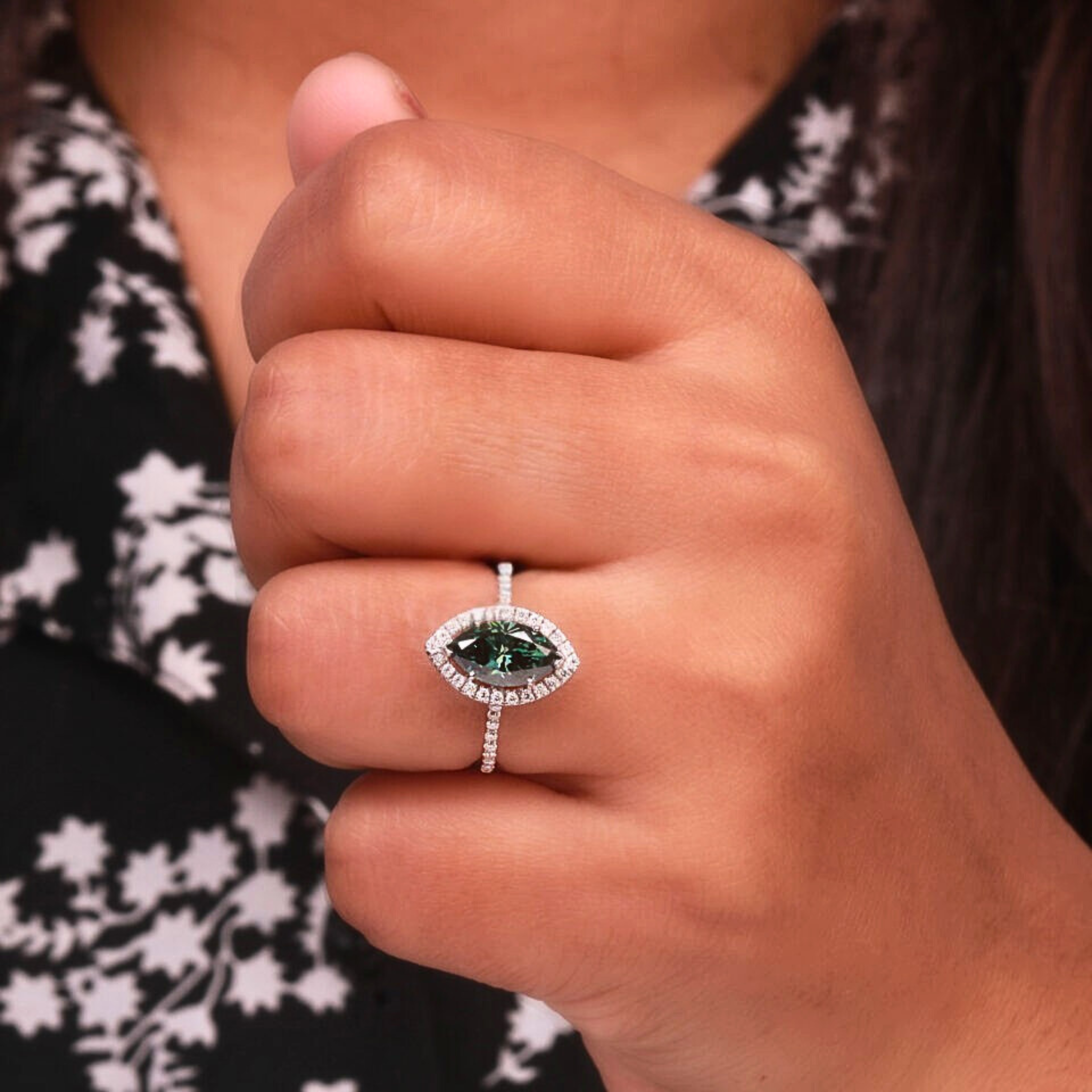 Make a bold and sophisticated statement with this Green Marquise Cut Lab Grown Diamond Halo Engagement Ring. Featuring a captivating 1.00 CT green marquise-shaped lab-grown diamond, this ring is surrounded by a shimmering halo of round green lab-grown diamonds totaling 1.05 CTW, enhancing its brilliance and elegance.