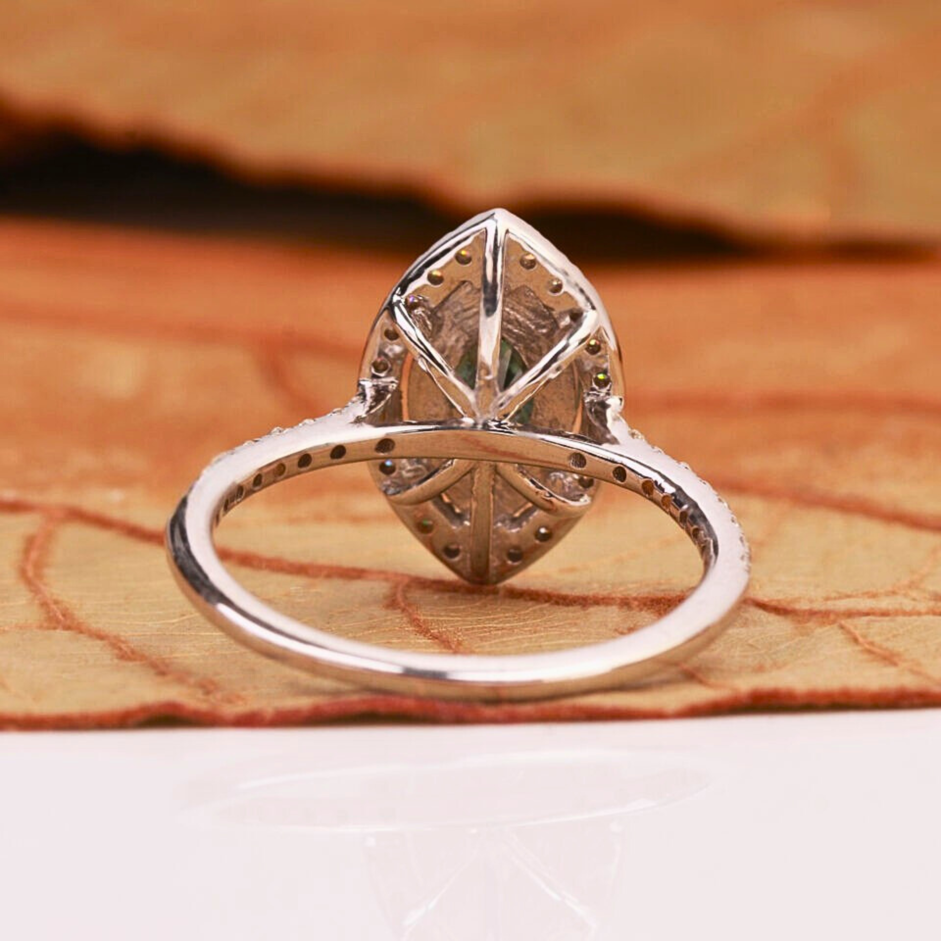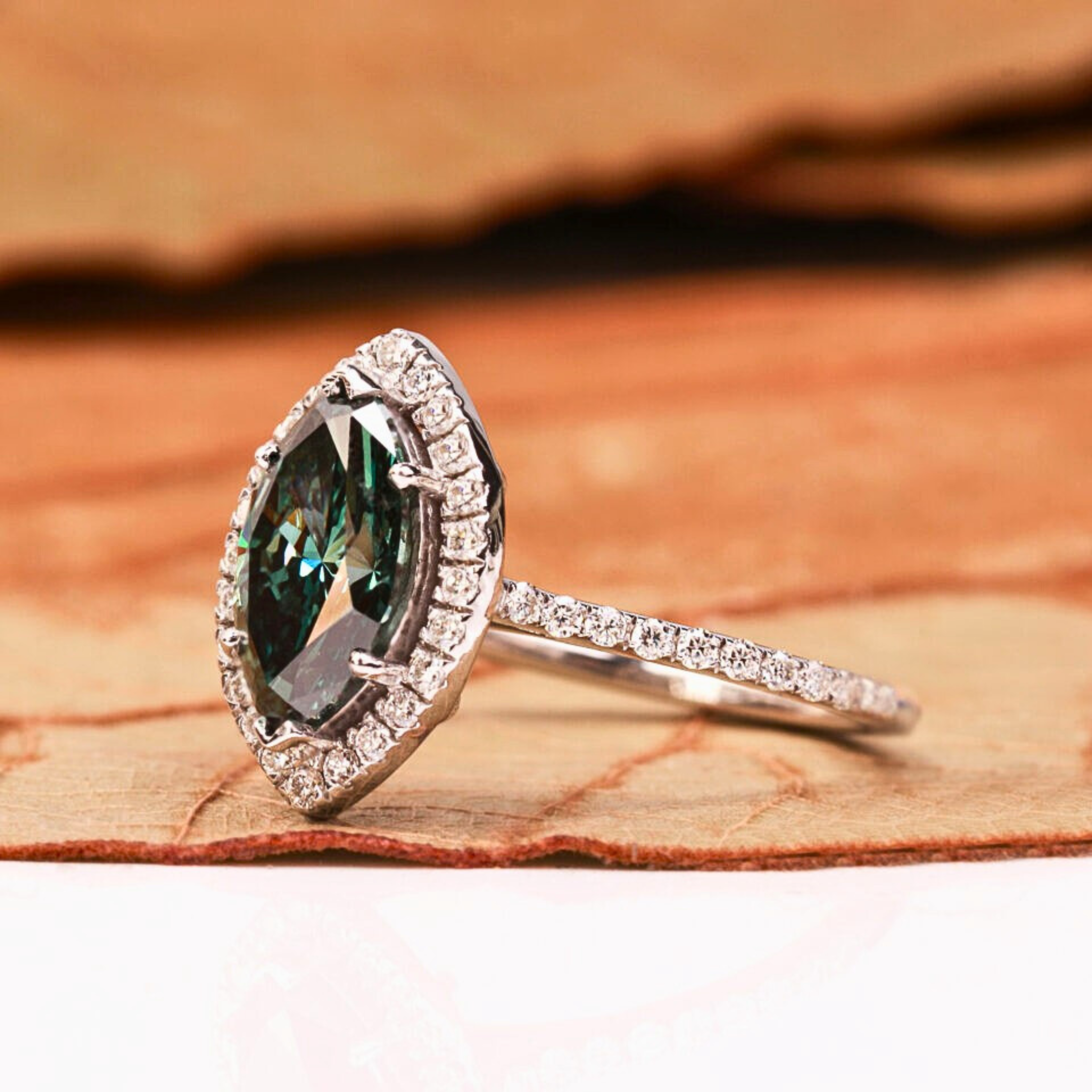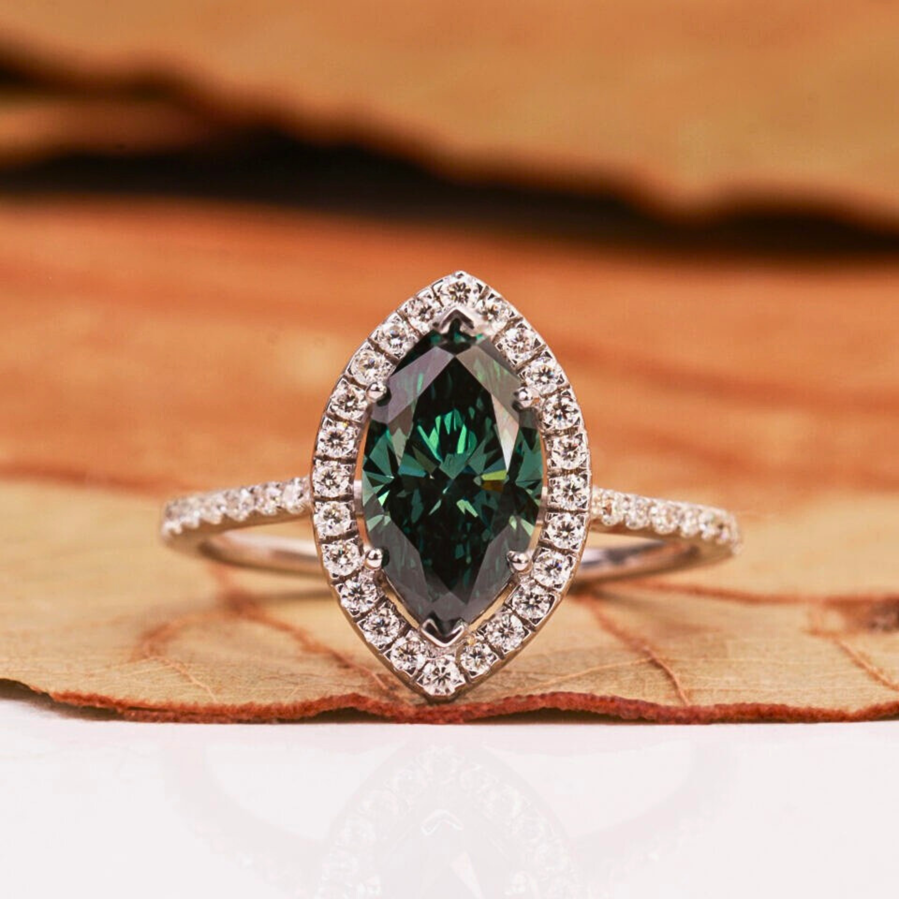 Make a bold and sophisticated statement with this Green Marquise Cut Lab Grown Diamond Halo Engagement Ring. Featuring a captivating 1.00 CT green marquise-shaped lab-grown diamond, this ring is surrounded by a shimmering halo of round green lab-grown diamonds totaling 1.05 CTW, enhancing its brilliance and elegance.